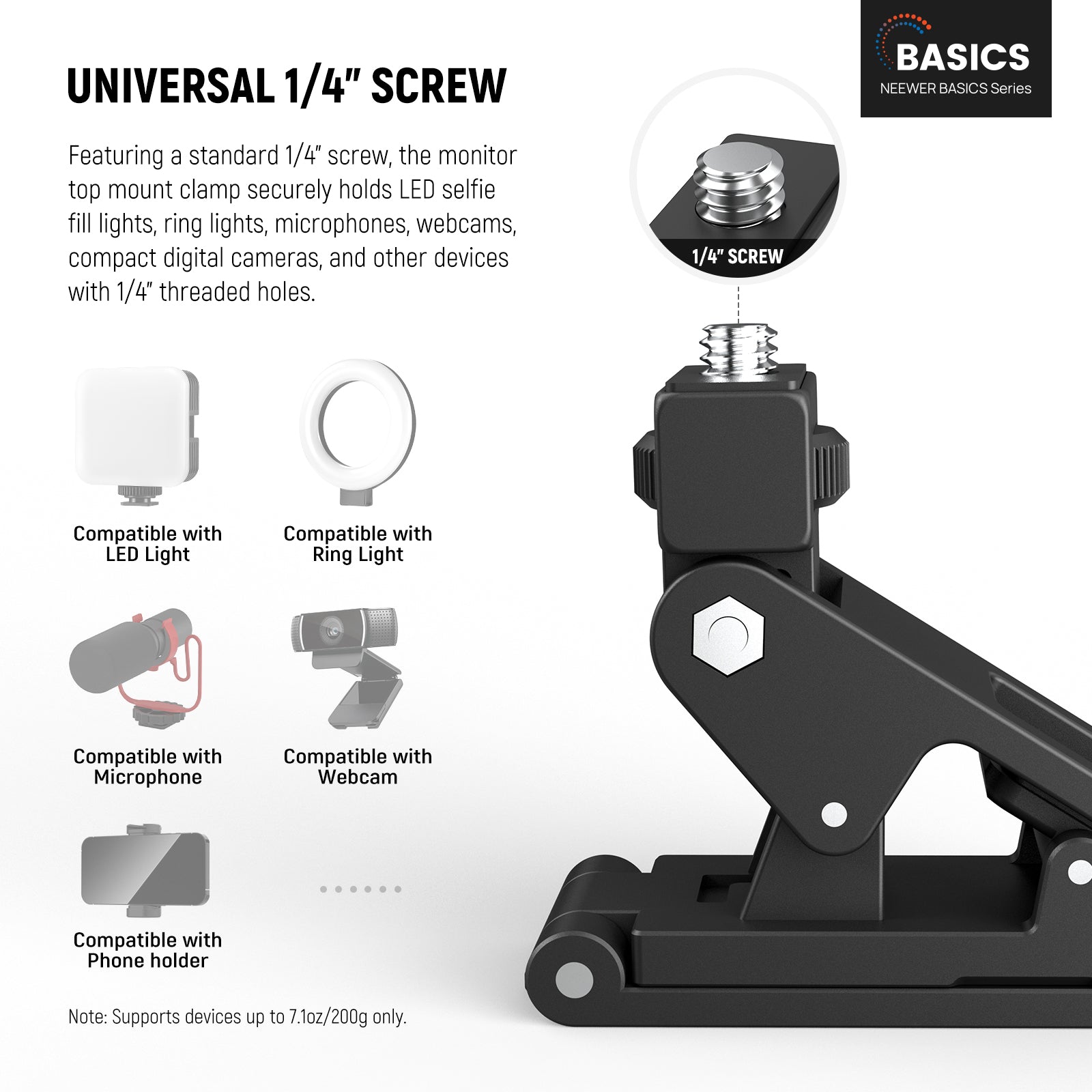 - Universal 1/4" Screw- Featuring a standard 1/4" screw, the monitor top mount clamp securely holds LED selfie fill lights, ring lights, microphones, webcams, compact digital cameras, and other devices with 1/4" threaded holes. Note: Supports devices up to 7.1oz/200g only