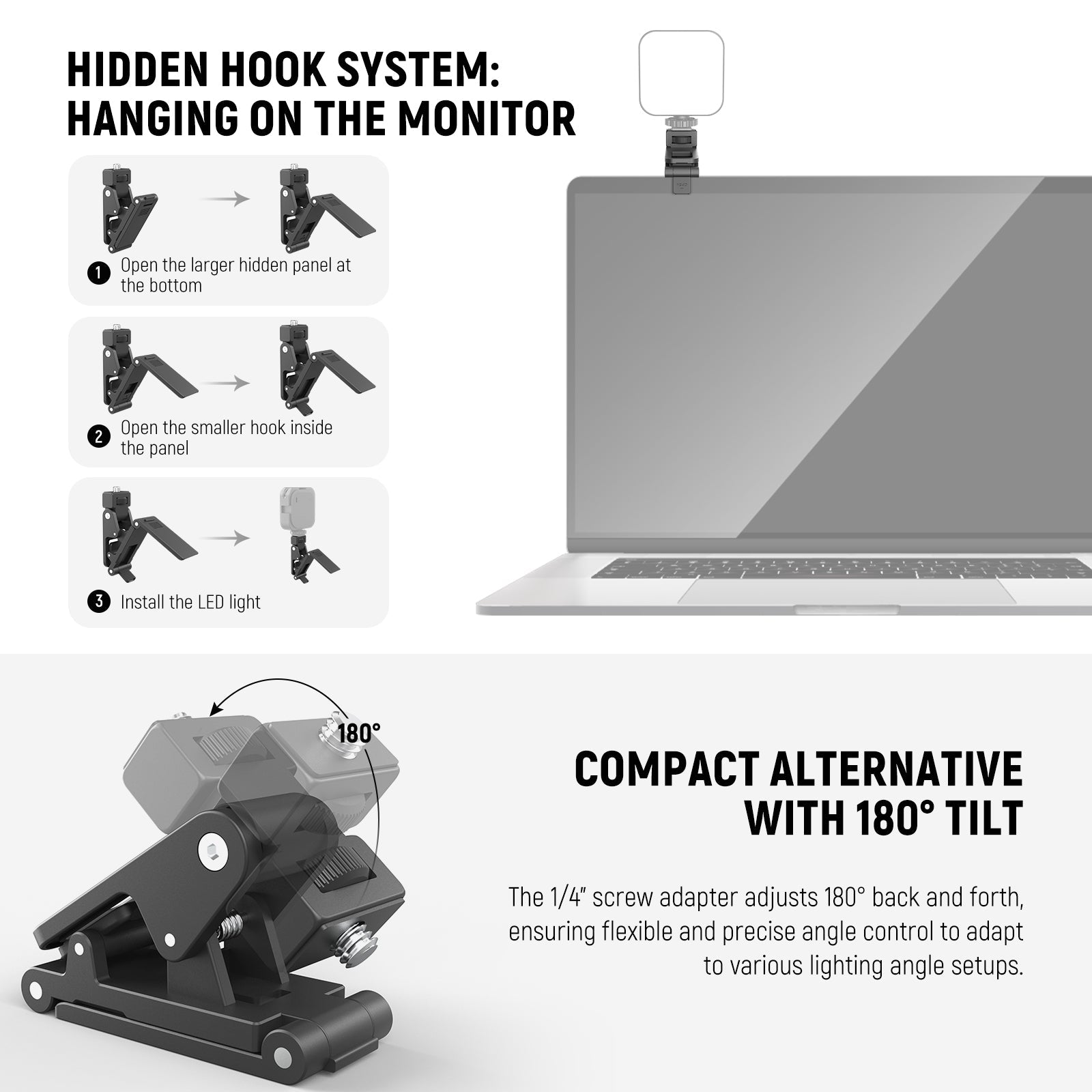 - Robust Spring Clamp with Rubber Pads- The spring loaded mechanism is crafted from premium steel, offering exceptional resistance to deformation. The rubber padded jaws provide a secure, nonslip grip without scratching the screen, keeping your ringlight firmly in place on the monitor. Also with a built in hook for convenient hanging on the monitor