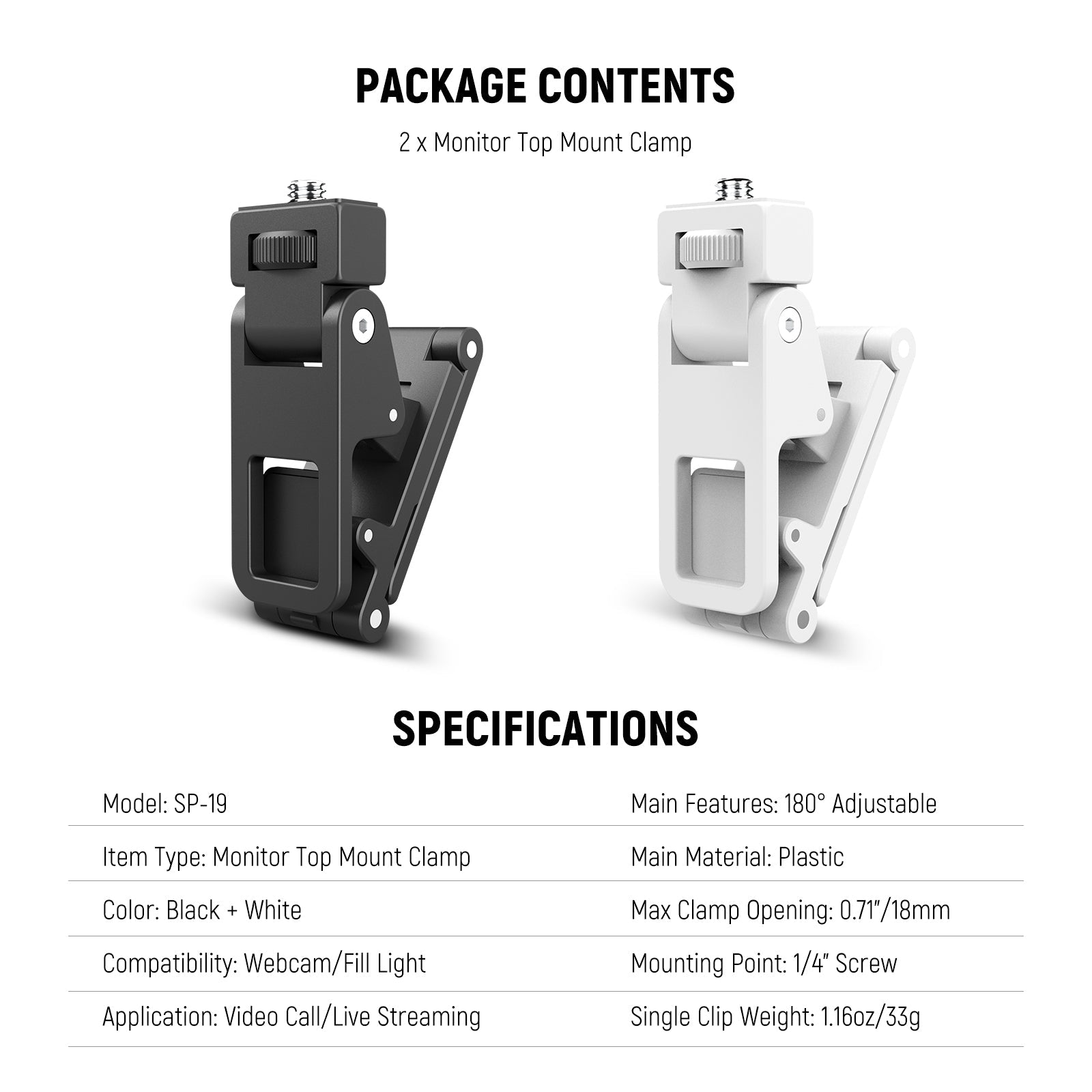 - Ideal Photography & Videography Accessory- With a max opening of 0.71"/18mm, the SP-19 mount clamp quickly and securely mounts your LED light to monitors, computer cameras, displays, laptop, smartphones for TikTok YouTube video recording filming, video conferencing, zoom calls, live streaming, selfies, vlogs, and more, or tablets, ideal as essential accessories/must have lighting gear for professional photographers & videographers, content creators, streamers, and social media influencers