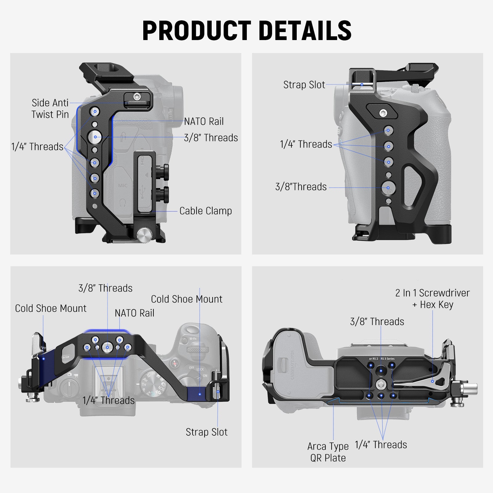 - Firm Installation By 3 Points- The cage will firmly attach to your R8 camera via a 1/4" mounting screw and two anti twist pins that fix the camera’s strap eyelets. A nonslip rubber pad protects the camera from scratches while adding extra stability