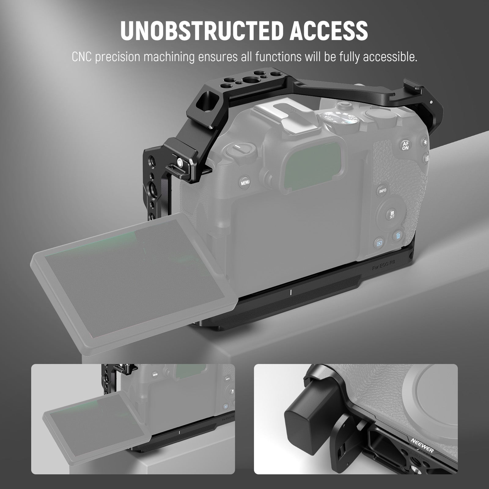 - All-in One Formfitting Aluminum Cage for Canon R8- Compatible with Canon EOS R8 camera only, the formfitting aluminum alloy camera cage is lightweight (5.7oz/163g) yet solid, which provides thorough protection and effortless handheld shooting experiences. CNC precision machining keeps the battery compartment, buttons, and LCD screen fully accessible