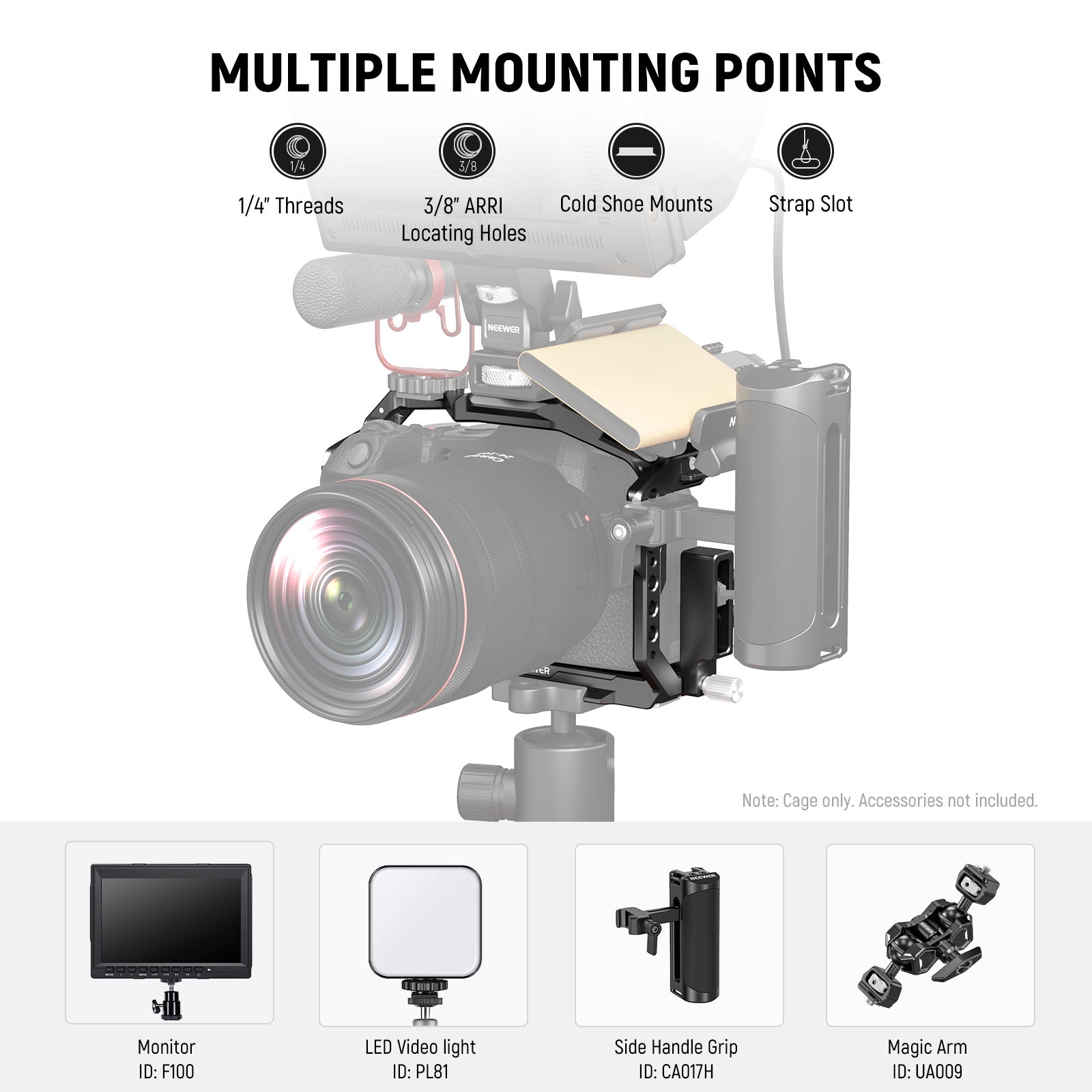 - Multiple Accessory Mounts- 1/4" threads for ST21 Dual Ball Head Adapter, 3/8" threads with locating holes for UA010 Magic Arm and MA004 Monitor Mount, cold shoes for video recording accessories like CM14 PRO vlog microphone and PL81 LED light, NATO rails for CA008 Top Handle and CA017H Side Handle Grip with nato clamps. Compatible with SmallRig top side handles. The 1/4" and 3/8" threads also allow for vertical and horizontal tripod mounting
