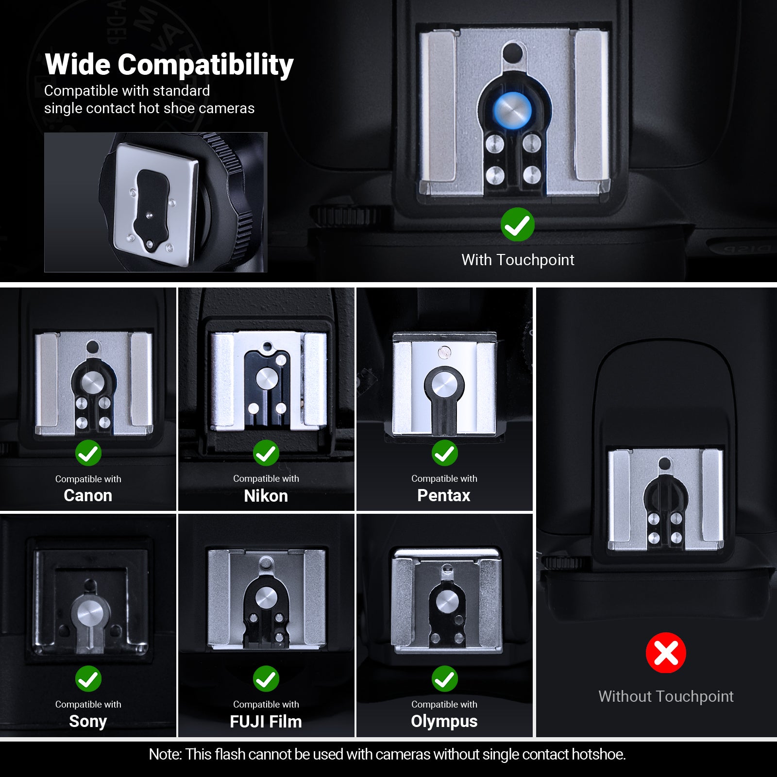 - Wide Compatibility- NEEWER TT560 flash attachment for photography accessories is compatible with Canon Nikon Panasonic Olympus Pentax Fujifilm standard hot shoe cameras and Sony MI hot shoe models including A9 A7III A7IV A7RIV A6400 ZV-1 A6000 A6300 A6500. Not compatible with Canon SL3 250D T7 1500D 2000D T100 3000D 4000D R6 200DII R50 Sony ZV-1F A9III A99 A77 A350 ZV1 Mark 2 Fujifilm X-A3X 100F X100T