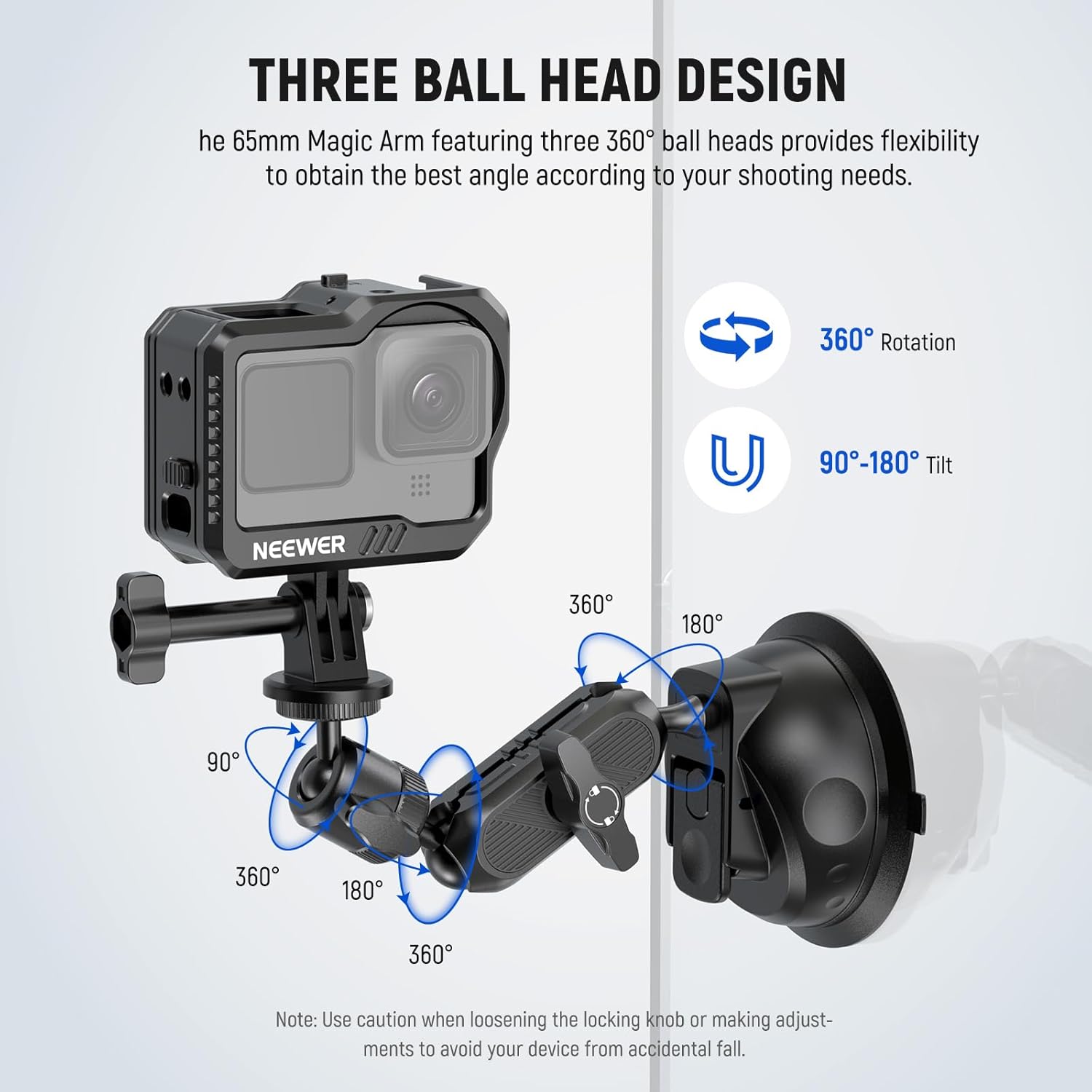 - Swivel 360° Ball Heads for Versatile Shots- The 2.6"/65mm magic arm of this photography kit has 3 flexible 360° ball heads for panoramic shots, a U shaped slot for 90° vertical tilt. A 1/4" screw for devices like compact mirrorless vlog cameras, camcorders, or accessories like an action camera adapter (Included), phone holders, making this suction mount compatible with GoPro hero 12 go pro 11 10 9 8 7 Black Max Insta360 x4 x3 insta 360 Ace Pro Go 3 DJI action 3 2, etc.