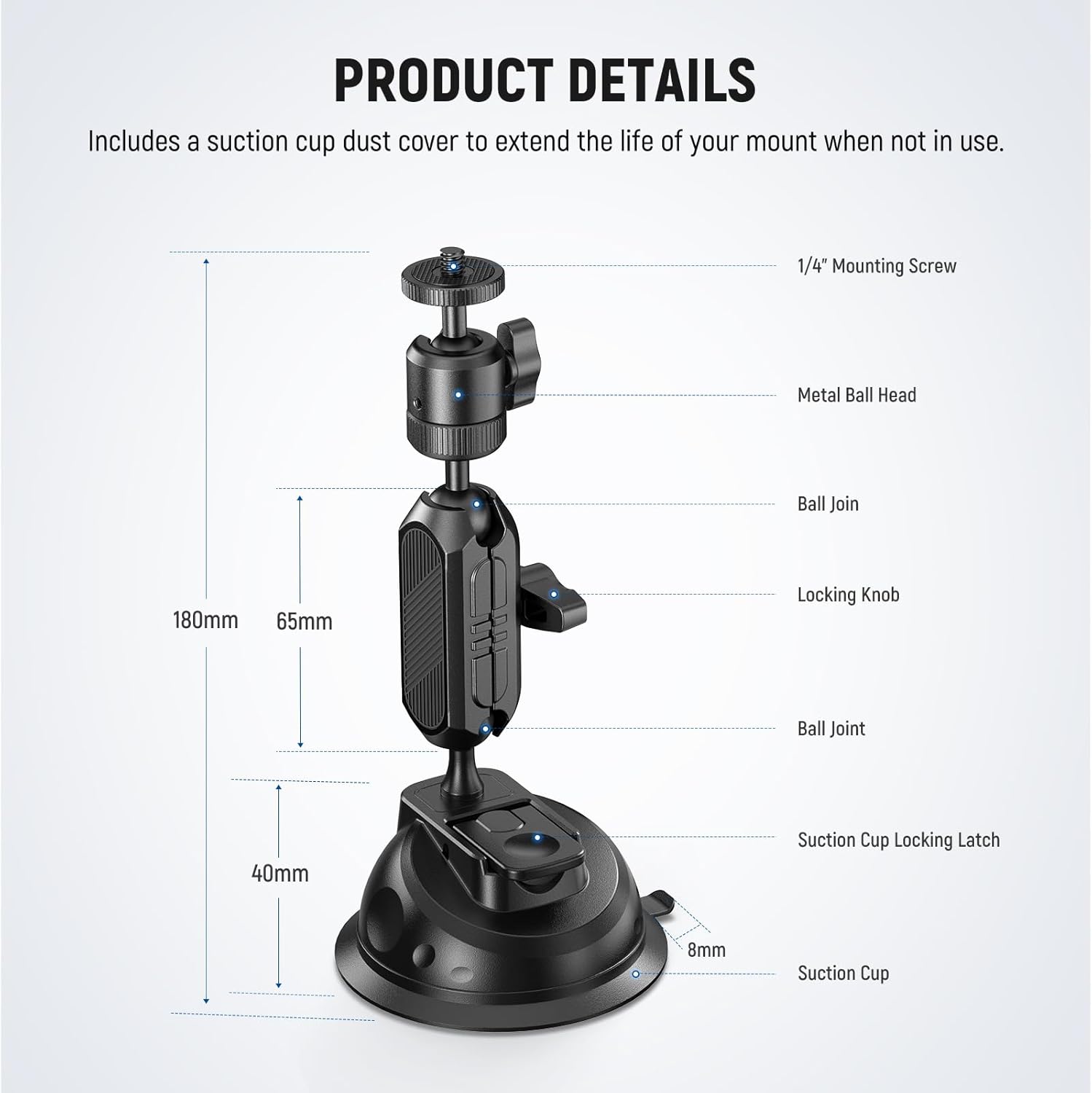 - Powerful Suction Cup with Magic Arm- The 3.35"/85mm suction cup mount holder with a flexible magic arm holds firm to any smooth, flat, and nonporous surfaces like the car windshield, window, dash, or tile, allowing your mirrorless camera, vlog camera, action camera, or smartphone achieve any desired angle for POV video recording. For safety, consider a lanyard (not included) when using it inside or outside the car, drive under 60 km/h, and check the suction strength hourly