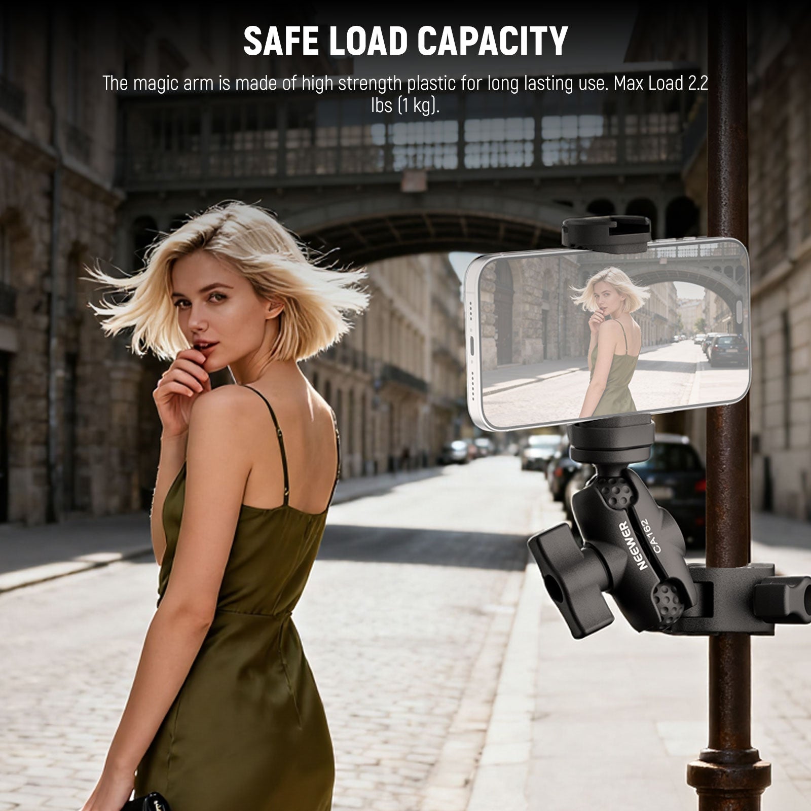• Super Clamp Camera Mount- The magic arm features a super clamp on one end and a 1/4" screw on the other, allowing you to securely attach your devices to tubular or flat surfaces, thanks to the included action camera mount and smartphone holder. With dual 360° ball heads, it supports multiple angle adjustments, making it especially useful for quickly adding or repositioning gear during photo shoots or video recordings