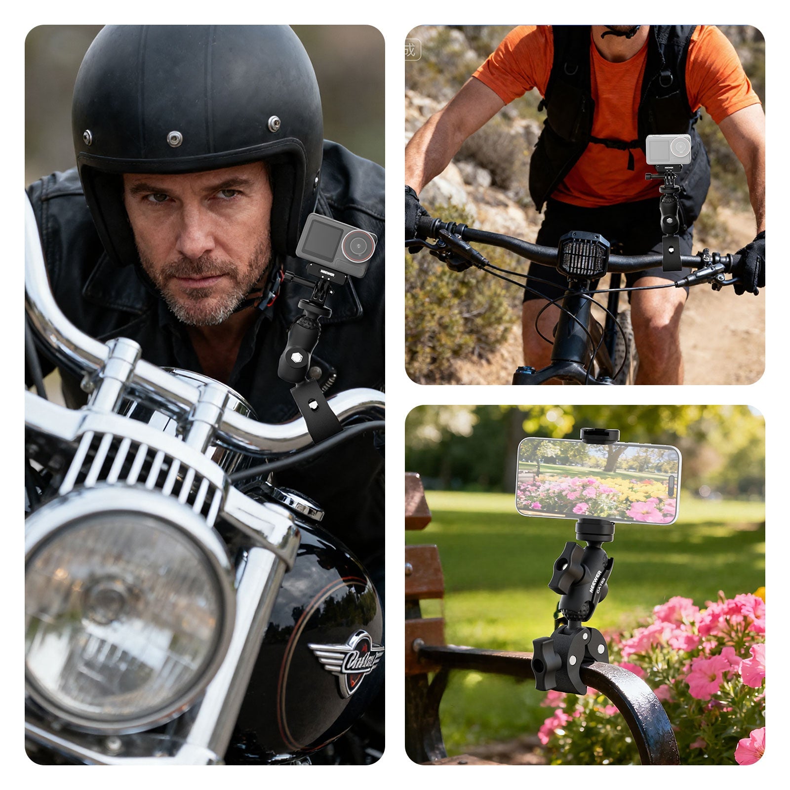 • For Action Cameras & Phones- This motorcycle/bike handlebar mount accessory and attachment pack is compatible with Insta360 X5 X4 X3 DJI OSMO Pocket 3 Creator Combo; compatible with GoPro Hero 13 Go Pro 12 11 10 Black. Or use adapter accessories (not included) to be compatible with DJI Action 5 Pro 4 3 2 Insta 360 Ace Pro Go 3S AKASO Brave 8 7 EK7000, etc. The kit included phone holder is compatible with iPhone 16 15 Pro Max Plus 14 Samsung Galaxy S25 S24 S23 Ultra Google Pixel 9 Pro and more