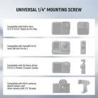 - Wider Compatibility- The action camera mount attachment is compatible with GoPro Hero 13 12 11 10 9 Black go pro max compatible with DJI OSMO Action 5 Pro 4 3 2 compatible with Insta360 X5 X4 X3 X2 GO3 S GO2 insta 360 Ace Pro compatible with AKASO Brave 8 7 combos. The 1/4" mounting screw is for connecting smaller DSLR cameras, video cameras, security surveillance cameras, camcorders, video lights, microphones, phone holders and more photography accessories