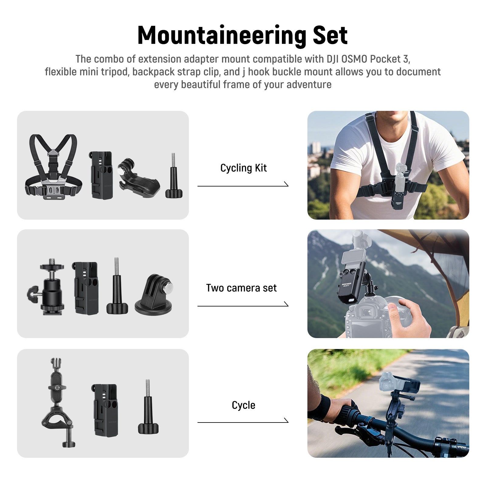 - Mountaineering Set- The combo of extension adapter mount compatible with DJI OSMO Pocket 3, flexible mini tripod, backpack strap clip, and j hook buckle mount allows you to document every beautiful frame of your adventure, ideal for camping, picnics, mountaineering, hiking, and more. The tripod is 360° adjustable, making it easy to capture unique angles of the landscape and different points of view as content creator essential and influencer must have gimbal camera photography accessories set