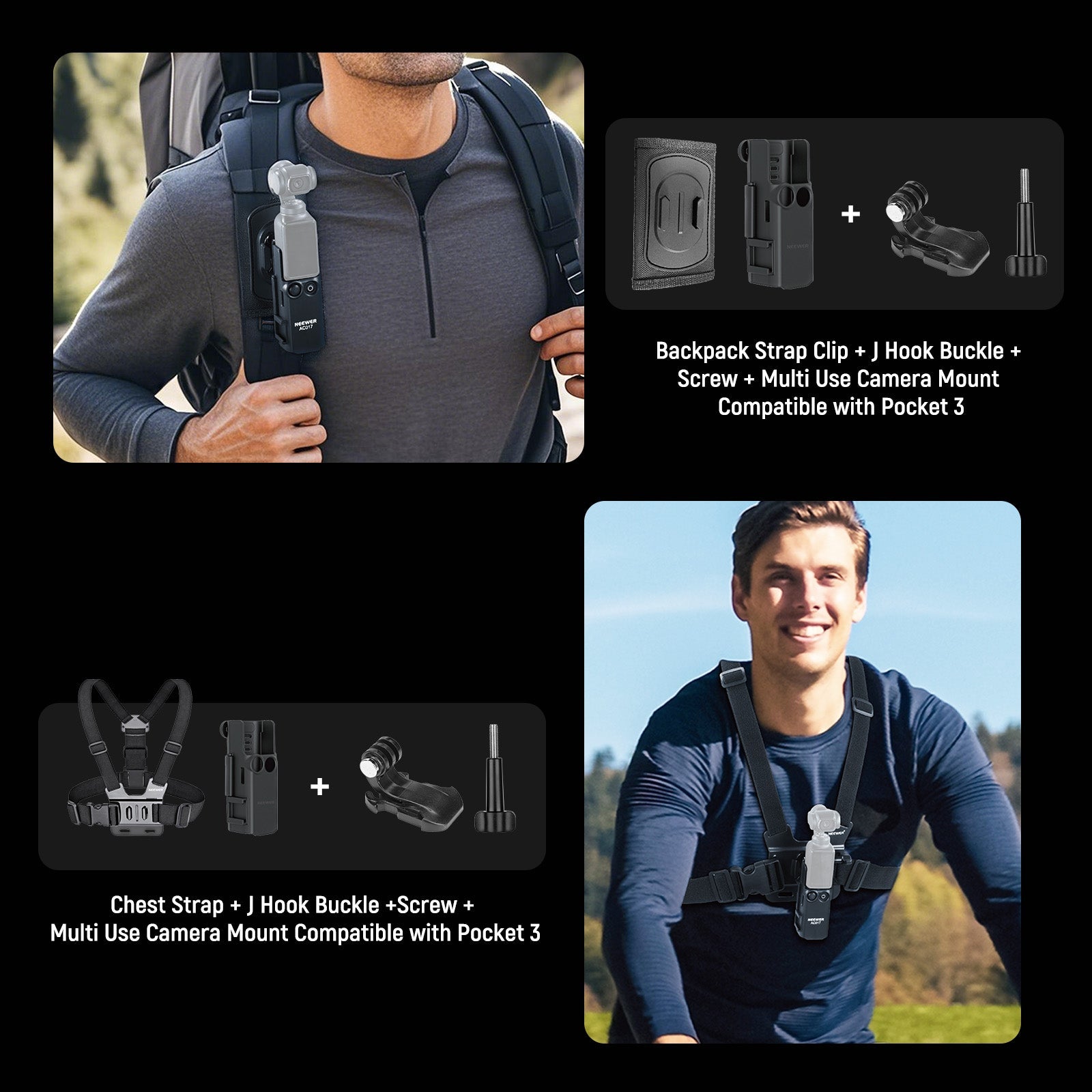 - Cycling Kit for Action Shots- The handlebar clamp mount, chest harness strap, J hook buckle mount, and extension adapter mount accessories compatible with DJI OSMO Pocket 3 offer an ideal setup for cyclists and release your hands, enabling secure camera placement on bikes, or body chests for dynamic, action packed shots and filming