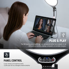 - Full Screen Ringlight with Edge Lit Design- Covered in a quality light diffuser panel and featuring advanced edge lit technology, the 168 LEDs deliver soft, evenly diffused, eye friendly lighting with no glare, enhancing your camera appearance by highlighting facial contours and features. Emitting up to 880lx/0.5m, the 10.5" large circle halo light with stand for video recording illuminates the finest details of your subject, providing wide, uniform lighting coverage for your workspace