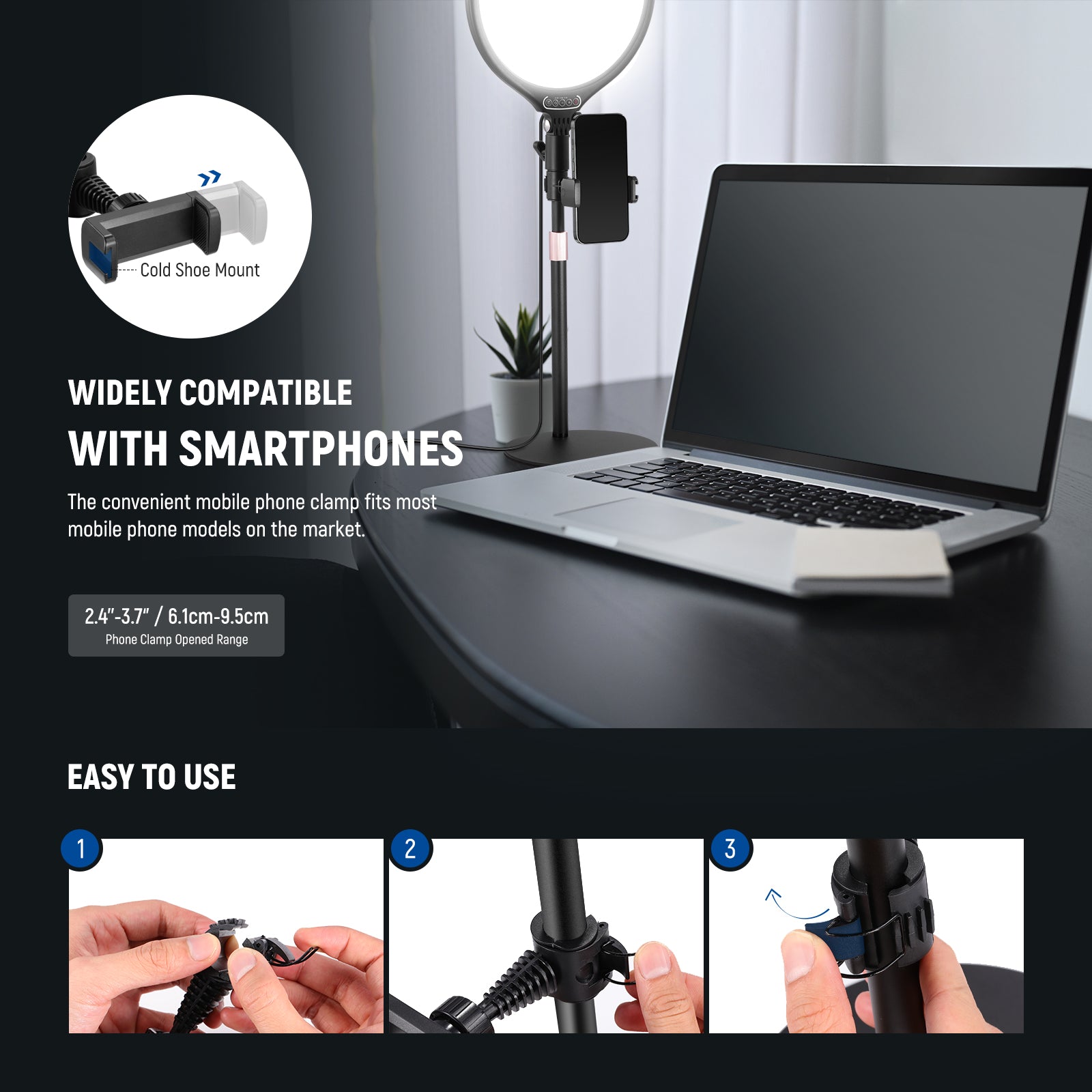 - Ideal for Phone Photography- A 360° rotatable phone holder mount of the overhead table ringlight enables portrait and landscape camera orientations. This photography and videography lighting gear and accessories kit for photos, pictures, films, video recording, vlogging, and filming creation, is compatible with iPhone 16 15 Pro Max Plus Samsung S24 Ultra cell phone and other smartphones