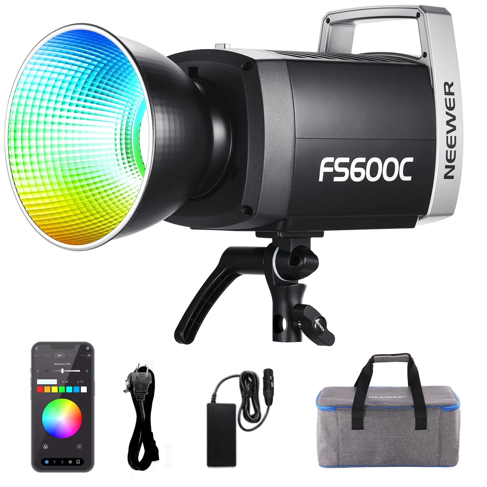 - Find More from Us- This continuous output lighting kit works with the NEEWER FR18 reflector kit (7" standard, medium focus, and long focus reflectors) to achieve varying levels of light intensity. When controlled via 2.4G or the NEEWER App, the FS600C supports group control alongside other NEEWER lights, including the AS600B, CB300B, CB300C, CB200B, CB200C, CB120B, CB100C, MS150B, MS150C, MC60B, MS60C, FS300C, FS230B, FS150B, FS150C, AP150B, AP150C, TL120C, and FL100C