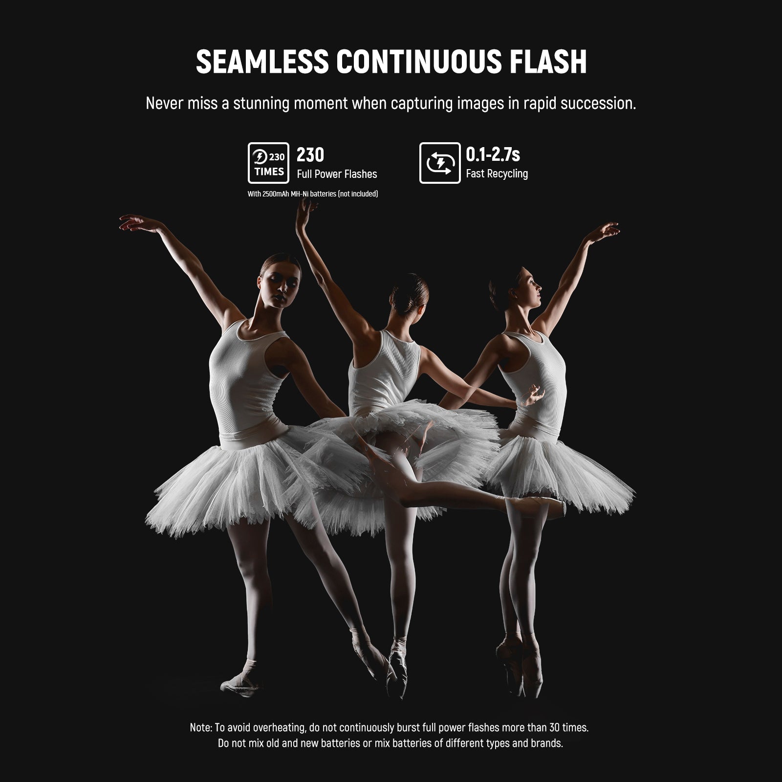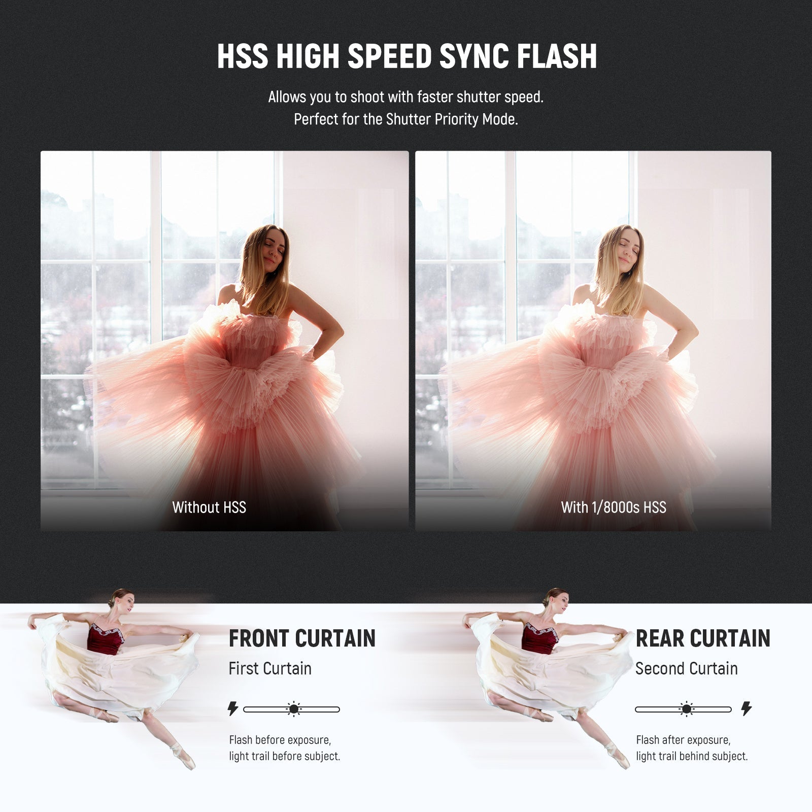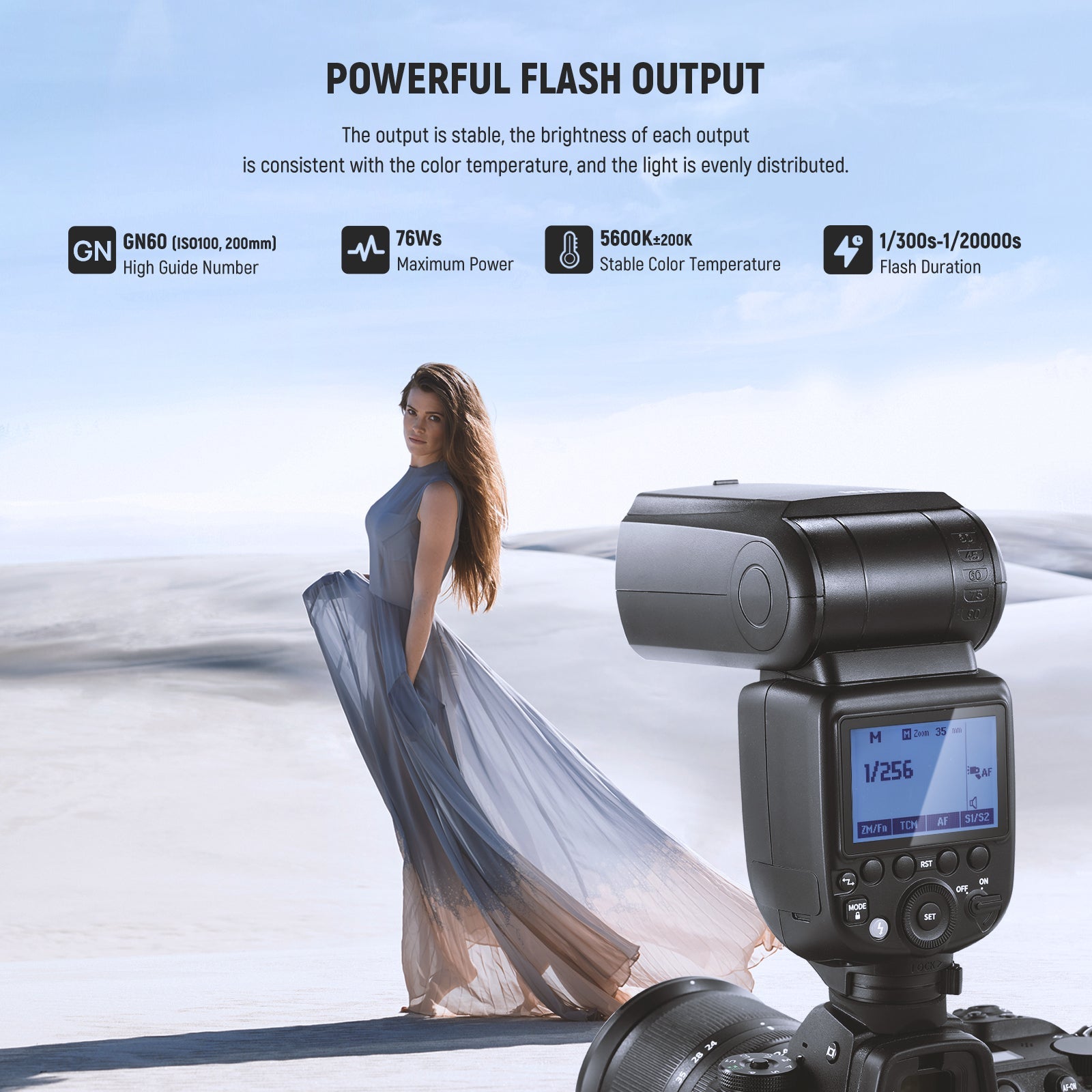 - TTL/M/MULTI Flash Modes- Built with TTL (auto), M (manual), and MULTI (stroboscopic) modes. The M mode supports 81 flash output levels (1/256-1/1) with a TCM switch to quickly convert between TTL and M. It also supports 1/8000s HSS high speed sync, 0.1-2.7s recycling time, 1/300s-1/20000s flash duration, 100 stroboscopic flashes (199Hz), flash exposure compensation (FEC), flash exposure bracketing (FEB), flash exposure lock (FEL), front/rear sync, and optical S1/S2