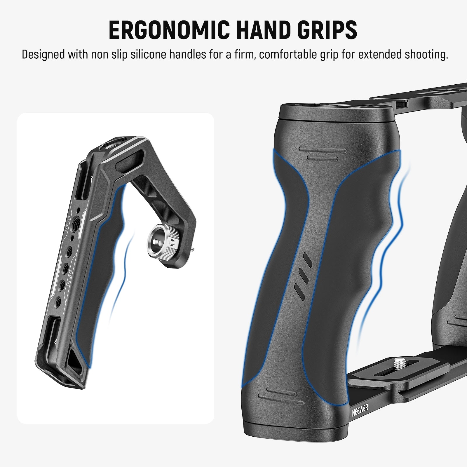- Dual Grips & Tripod Mounted- The two ergonomic hand grips with synthetic leather texture and finger contours offer you a comfortable and firm grip on the cage for handheld shooting, or mount it on a tripod head via the 1/4" screw holes on the bottom, for seamless switching between handheld and tripod shooting, thanks to its Arca type base