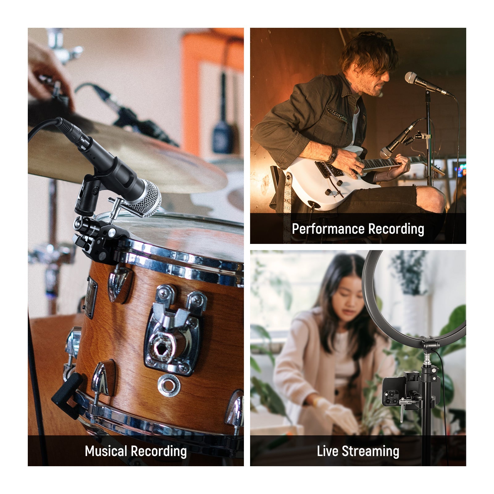 - It is widely used because of its flexibility and versatility. The clamp could be used to connect the tripod to the microphone. The clamp comes with on slip rubber at the jaw, which is mounted to the desktop, pipe, and crossbar firmly and will not scrape them. The maximum opening of the clamp is 2.05"/52mm and it could be adjusted by the adjustment knob.
