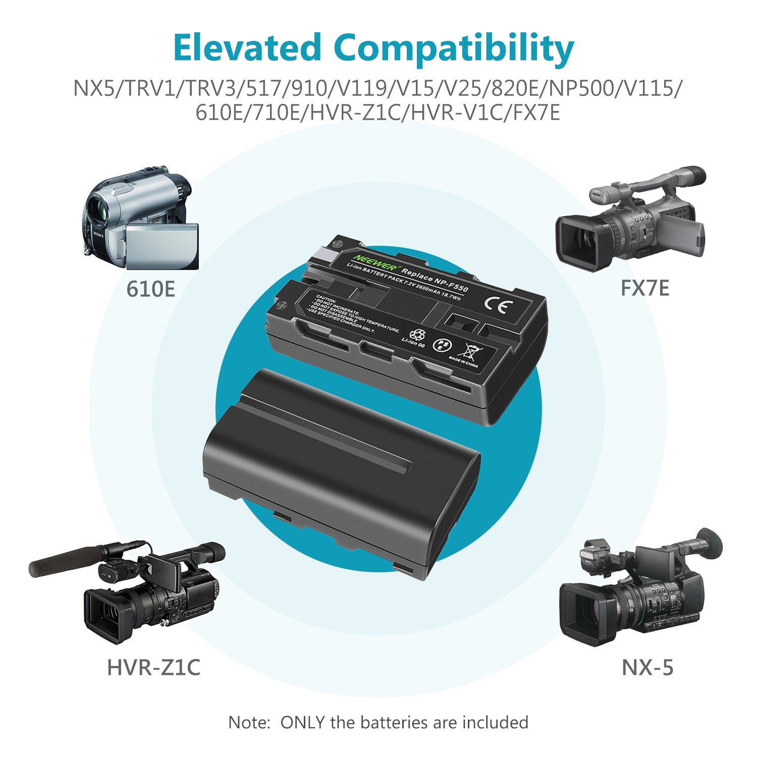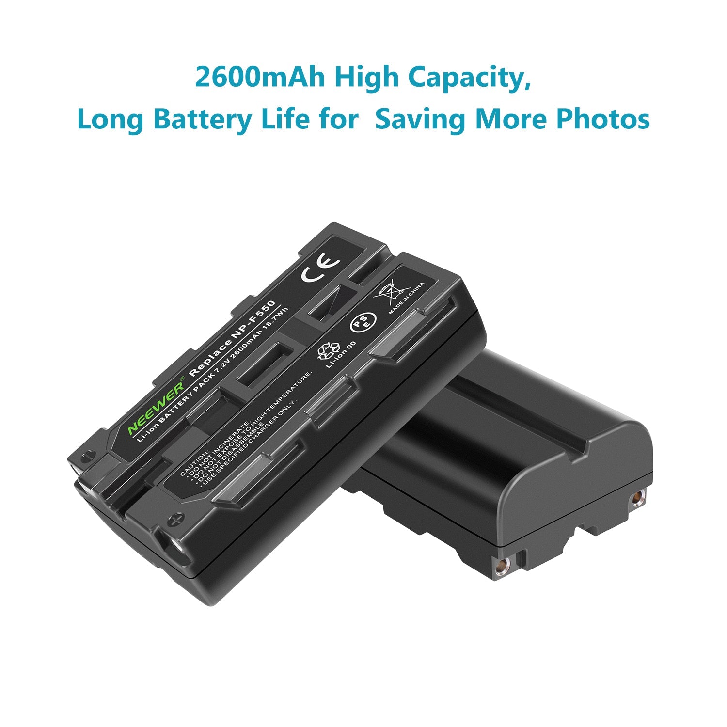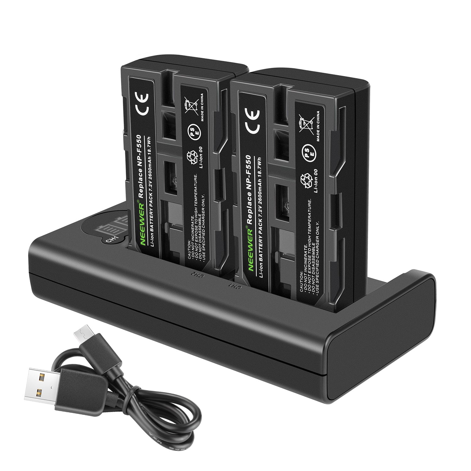 - 2 Packs 2600mAh/18.7Wh F550 Replacement Batteries can either be charged when installed in the camera or be directly powered with the 5V/2.1A USB input charger.