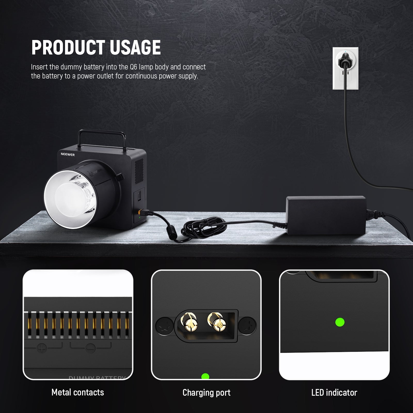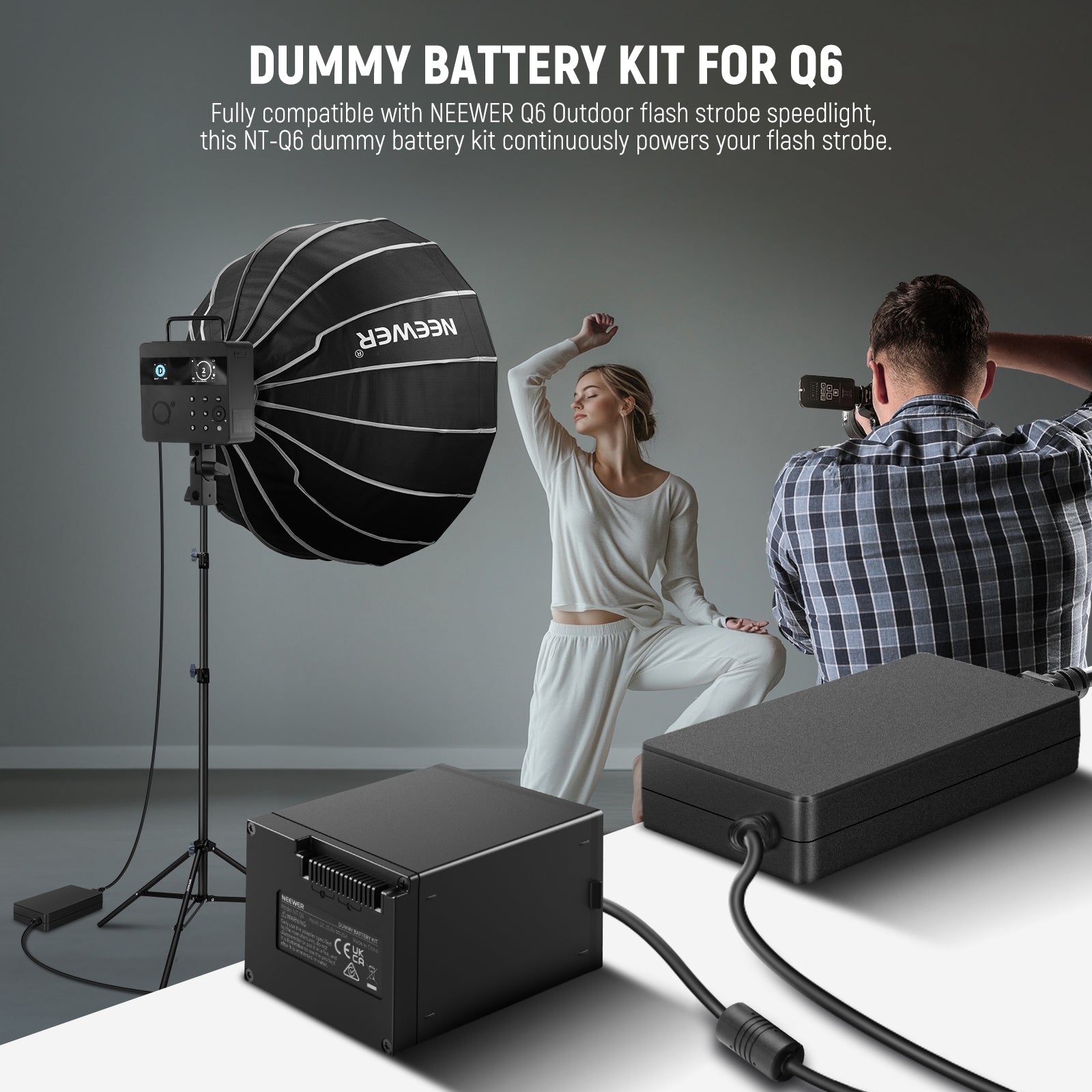 - Dummy Battery Kit for Q6- Exclusively compatible with NEEWER Q6 Outdoor flash strobe speedlight, this NT-Q6 dummy battery kit continuously power your flash strobe, avoid the frequent battery replacement of the NB-Q6 lithium battery (the standard battery for the Q6 flash) via the included AC power adapter and cable, perfect for studio and indoor photography, vlogging, live streaming, and filmmaking