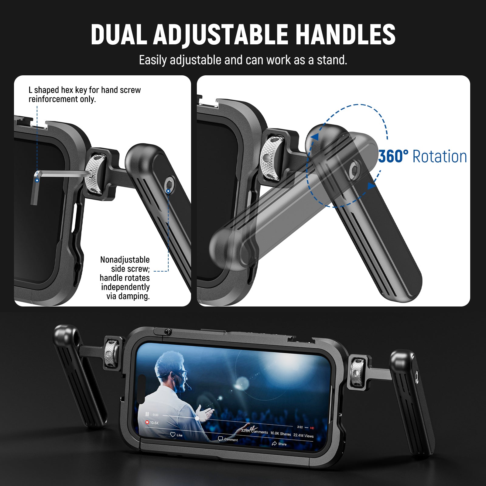 • Compatible with iPhone 15 Pro/ Pro Max- Designed for iPhone 15 Pro/ Pro Max, this form fitting video cage with internal rubber lining shields your phone with a slim fit for everyday use, such as YouTube/TikTok vlogging, live streaming, selfies, and filmmaking
