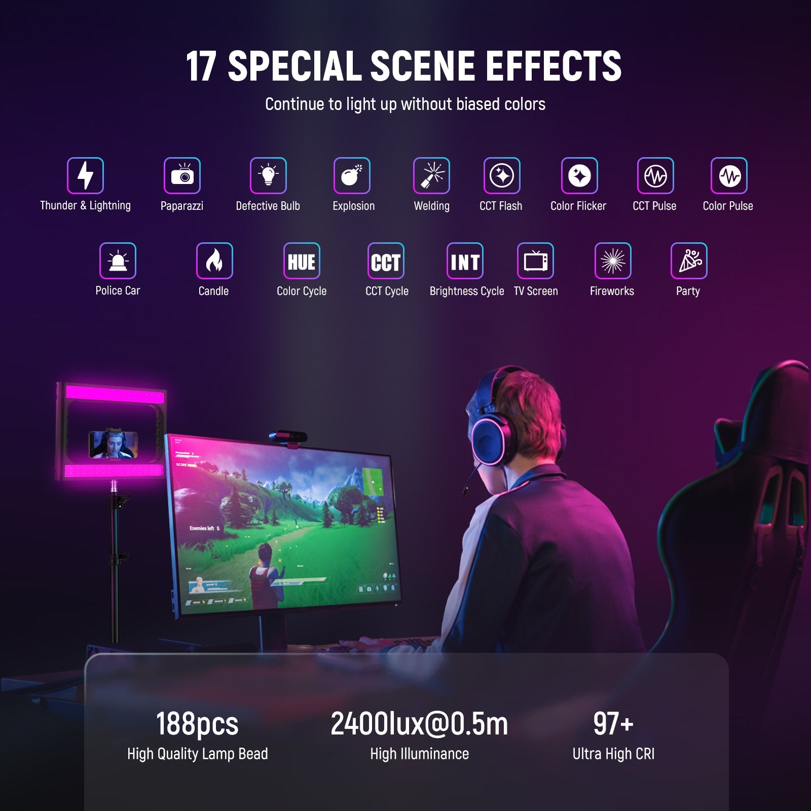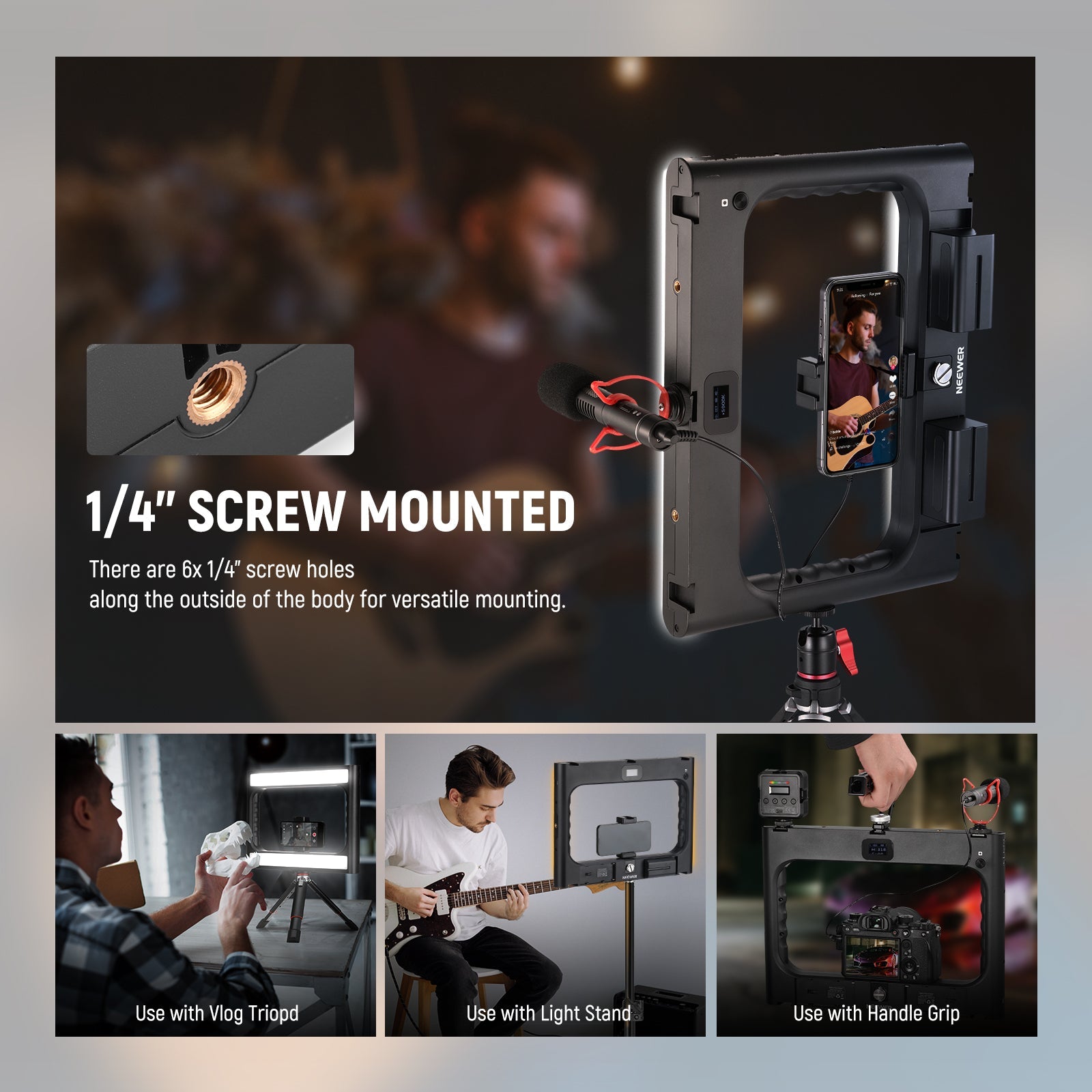 - 3 Selectable Lighting Modes- The right handle adds a 1/4" screw hole to support the light mounted on a tripod to achieve vertical shooting. 5 cold shoes allow you to mount LED fill lights or a microphone for expanded functionality. Six 1/4" threads allow you to attach the rig to a tripod in vertical or horizontal orientations, ideal for live streaming, photography, outdoor vlogging and YouTube/TikTok video production