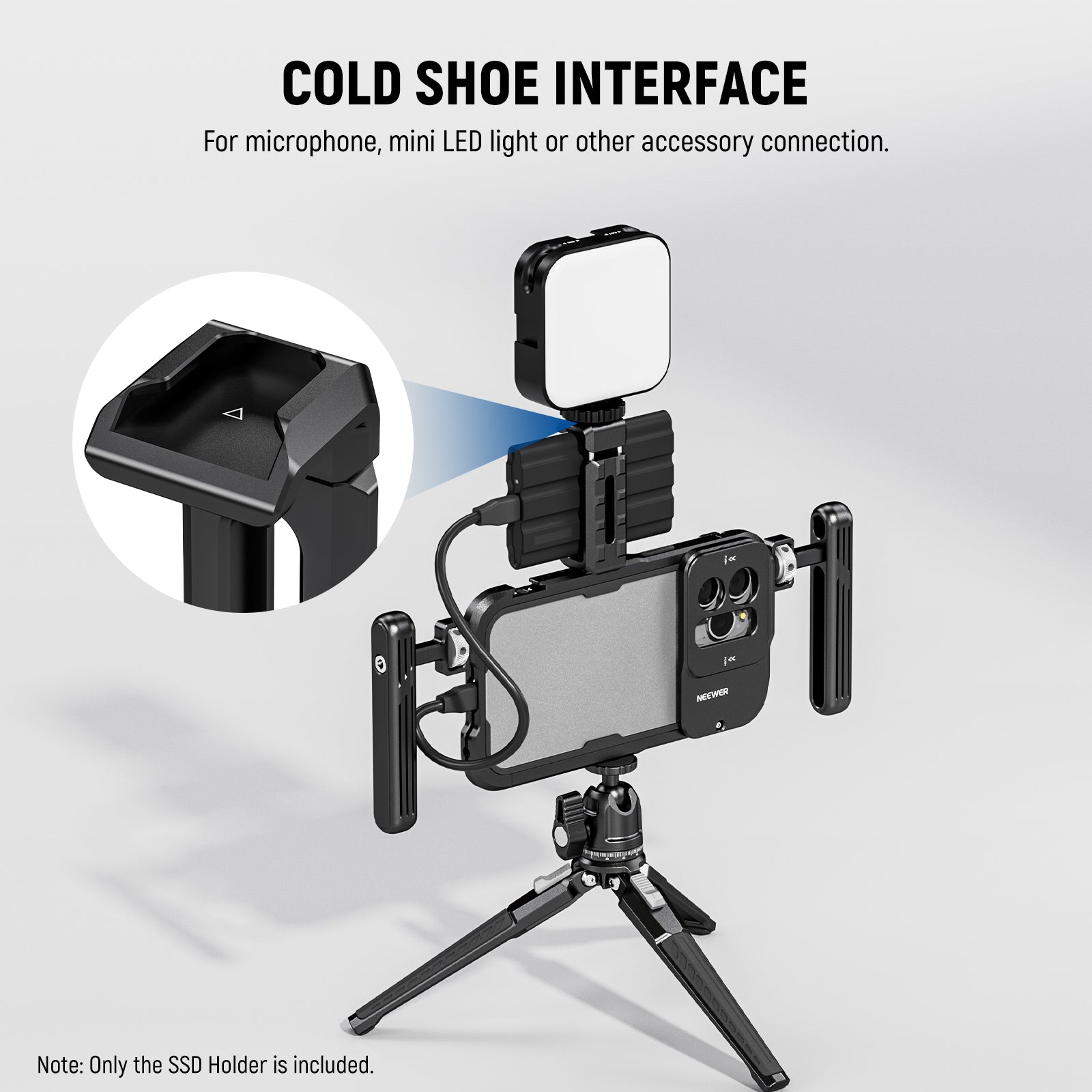 Direct Video Saving For iPhone 16 15 Pro/15 Pro Max- Attach this SSD clamp holder to the cold shoe of NEEWER PA023/PA024 phone cages for iPhone 16 15 Pro/16 15 Pro Max to enable direct saving of 4K and ProRes videos recorded on the 16 15 Pro and 16 15 Pro Max to the T5/T7/T9 SSDs, and enjoy ample storage space for unlimited creative possibilities