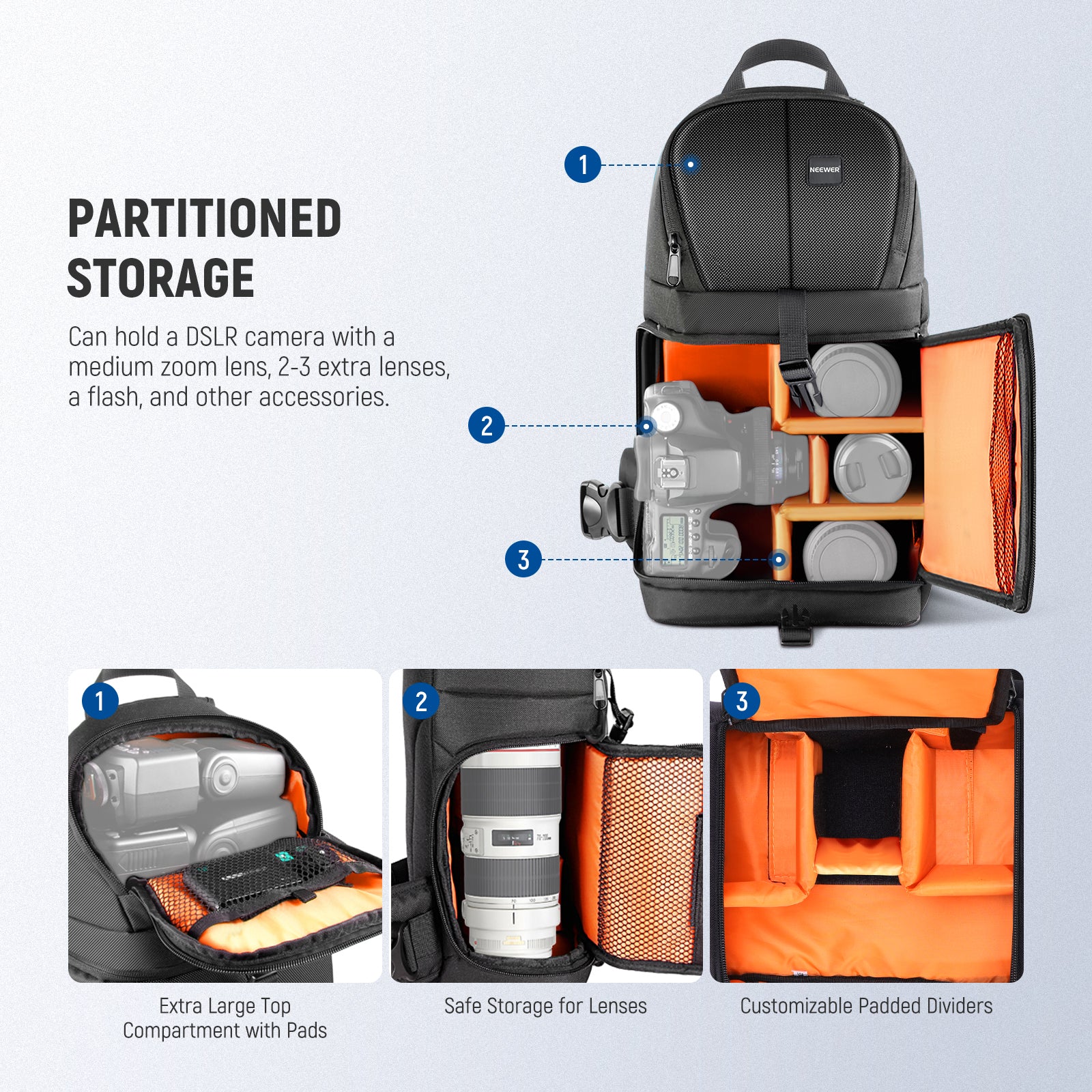 - Capacity: a DSLR with an attached medium zoom lens, 2-3 extra lenses, a flash unit, and other accessories (such as memory cards, cables, battery, and charger)