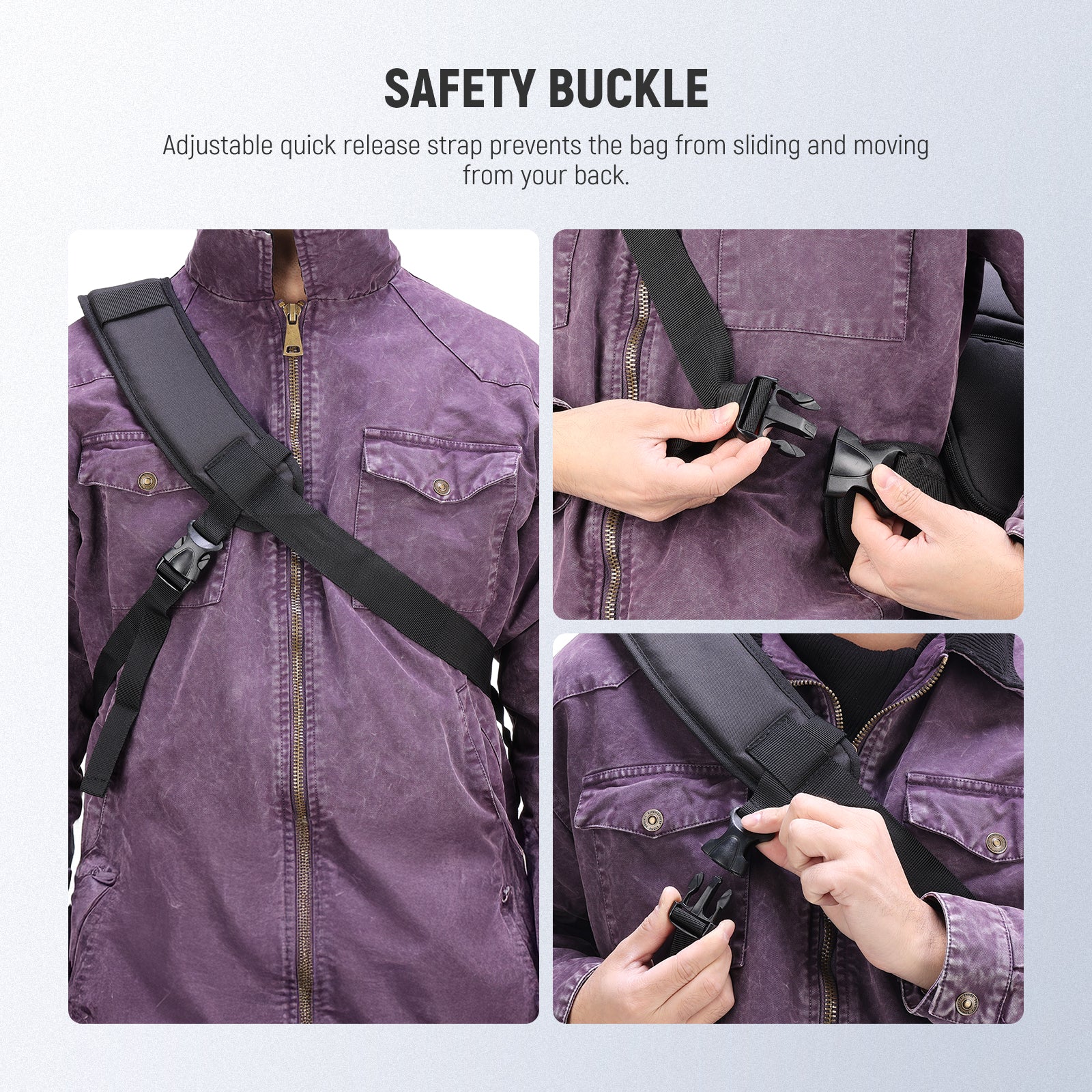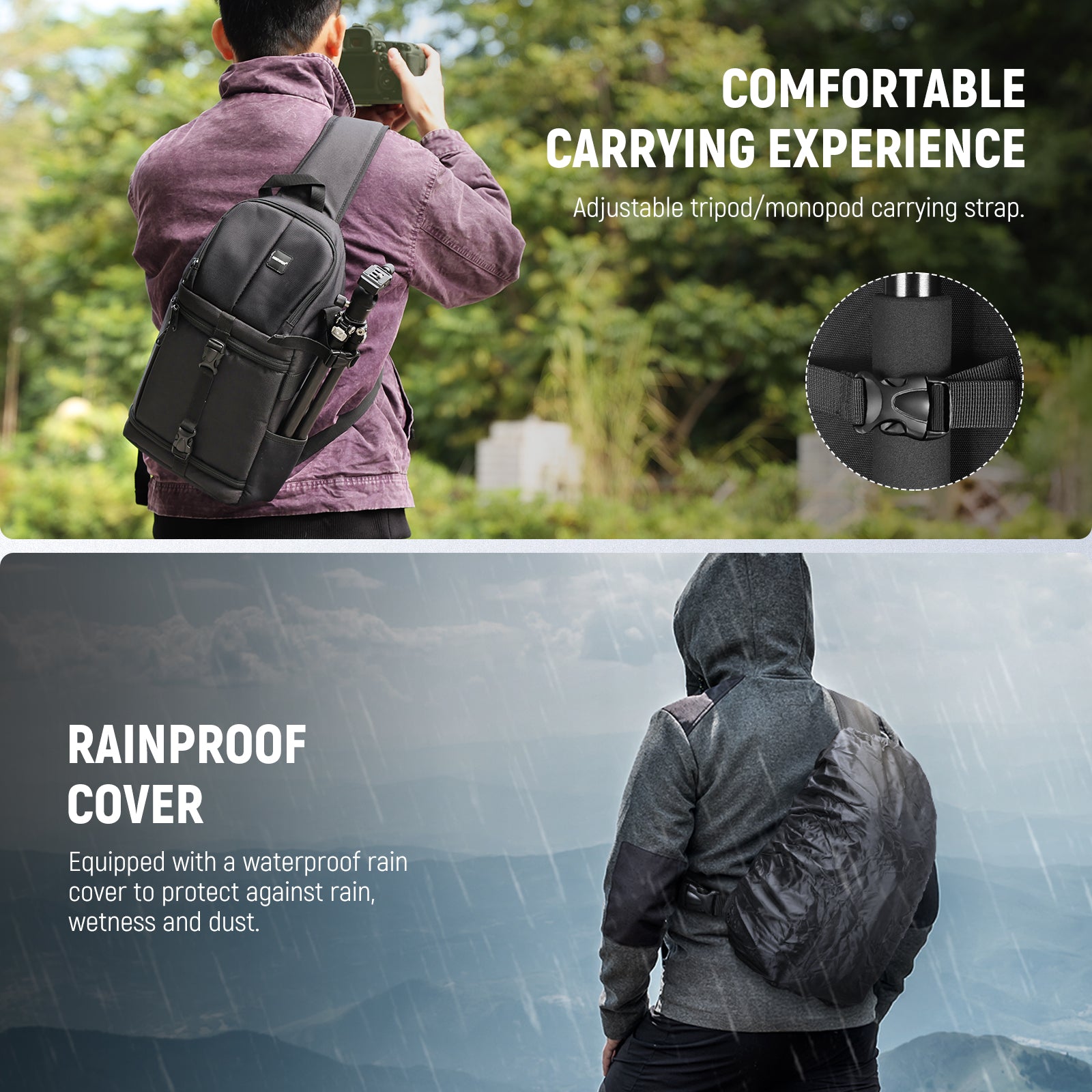 - Tripod Holder- A tripod or monopod can be firmly held by the buckle strap in the side of the bag.