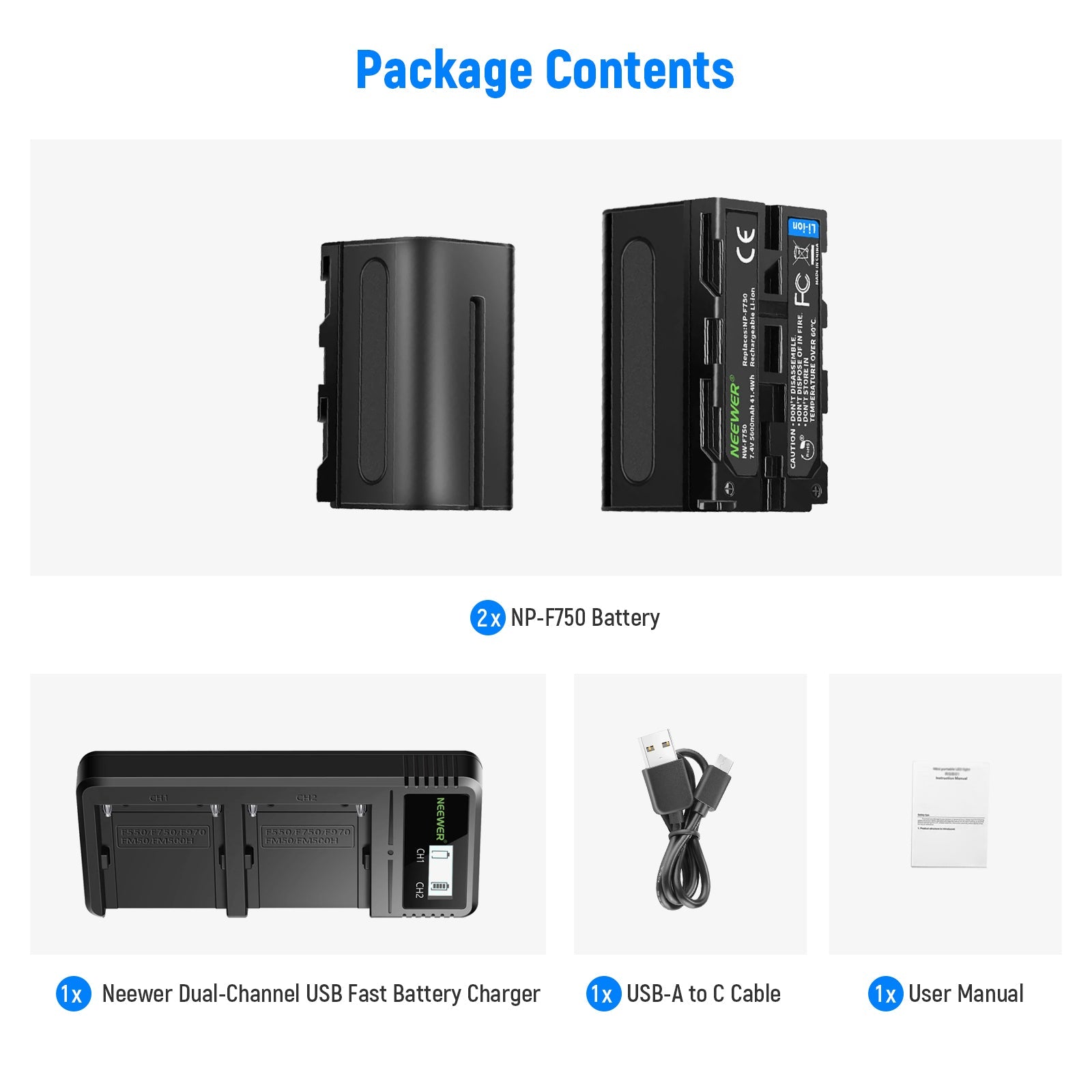 - Wide Compatibility- Compatible with Sony NP-F330, NP-F530, NP-F550, NP-F570, NP-F750, NP-F770, NP-F950, NP-F960, NP-F970, and NP-F975 batteries.