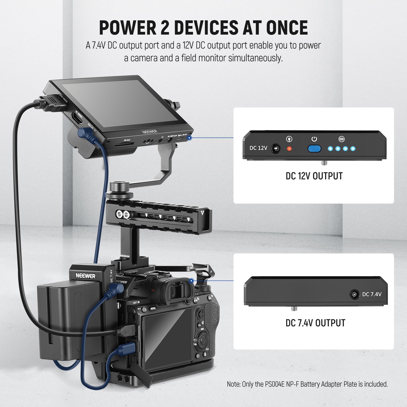 - Dual Output Ports- 7.4V male DC output port (5.5x2.1mm) and 12V male DC output port (5.5x2.5mm) split battery power to charge a digital camera and a field monitor simultaneously. Note: DC cables are sold separately