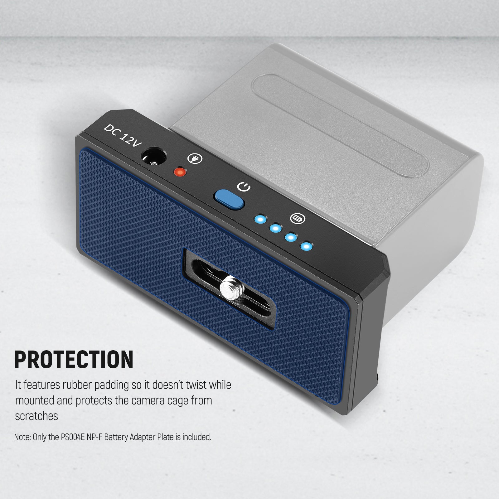 - Power On the Go- Attach PS004E to a camera cage through the 1/4” thumbscrew or two 1/4” screws and extend the battery life of your camera while on the go. The rubber pad adds stability and protects your equipment from scratches