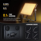 - 3 Lighting Modes & Accurate Dimming- The LED film light offers 3 lighting modes: CCT, /FX, and SOURCE, of which CCT provides a wide color temperature range of 2500K-8500K for bi color switching, FX presents 13 scene effects, and SOURCE offers 14 light source options. The PWM technology enables precise dimming with 0.1% increments across 0-100% and provides 4 dimming curves (Exponential, Logarithmic, S, and Linear) for diverse lighting setups