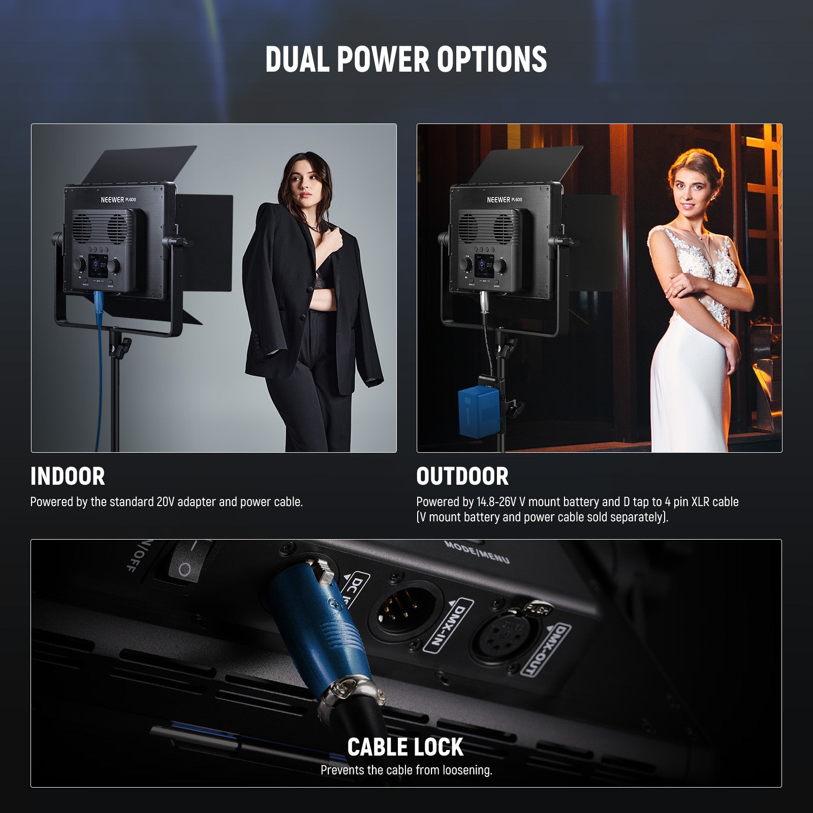 - Dual Power Options for Indoor & Outdoor Lighting- This portable panel video light gear is operated by AC power with the included 20V adapter and AC power cord. Or when wall outlets are unavailable, you can power it using a V mount battery (14.8-26V ) and D tap to 4 pin XLR cable (battery & D tap cable sold separately), ensuring prolonged outdoor photography and videography. The DC port with a locking design to prevent accidental power disconnection during use