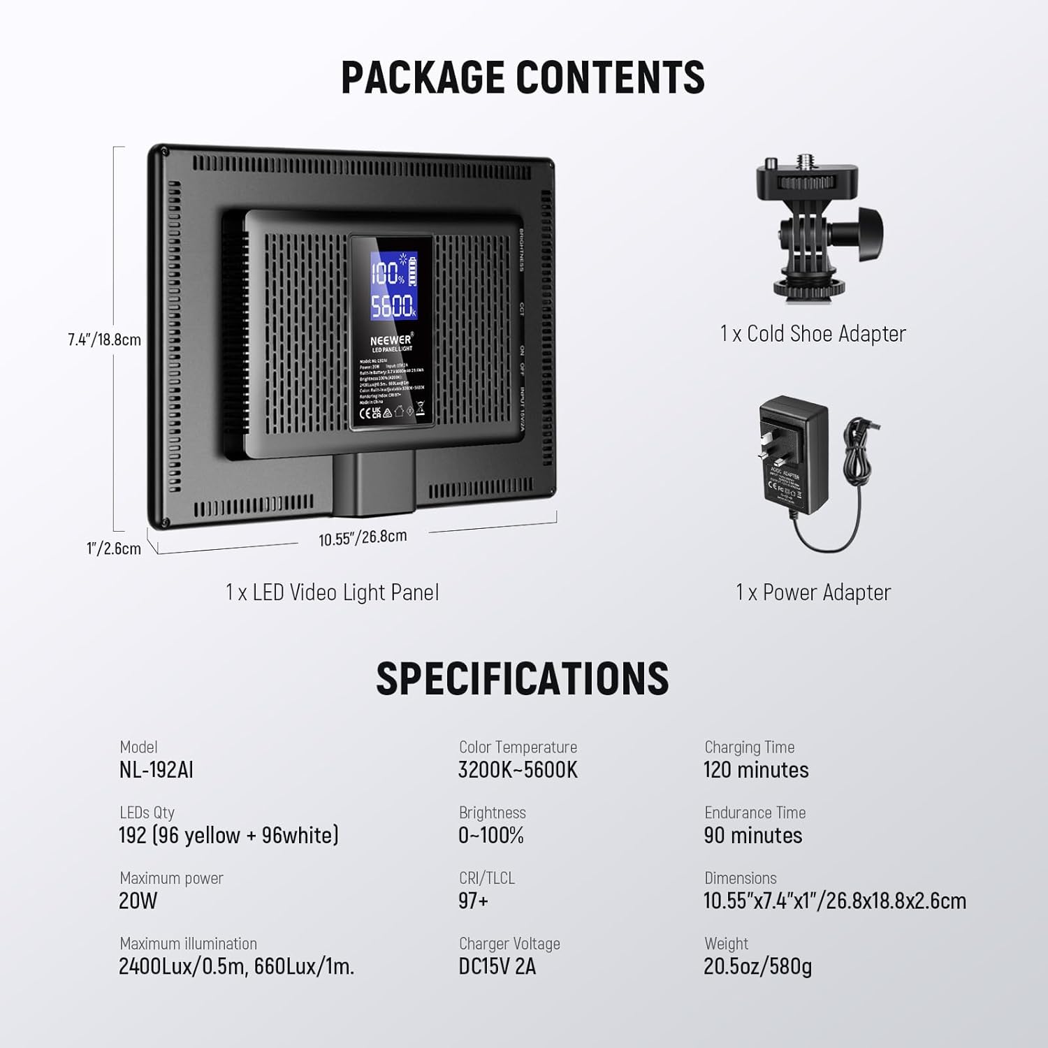 - Bi-Color Dimmable & LCD Display- This 20W bi-color video light features 92 energy saving LED beads (96 yellow + 96 white), 0~100% dimming, 3200k~5600k color temperature, CRI 97+ for optimal lighting, a maximum illumination of 2400Lux/0.5m, 660Lux/1m. The generous LCD screen on the rear clearly shows the color temperature, brightness, and battery power status all at a glance, and the heat dissipation holes ensure efficient cooling