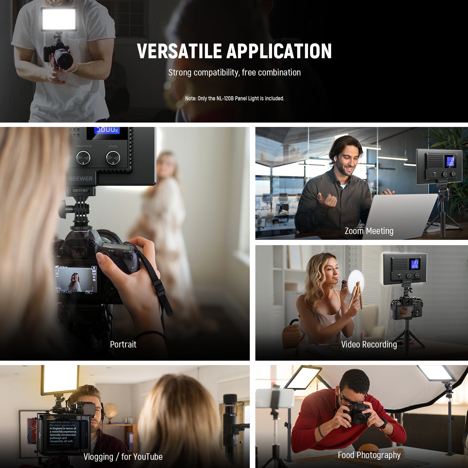 - Bi Color Lighting with Stepless Dimming- This NL-120Bl panel continuous light allows for precise adjustment of color temperature from 3200K to 5600K and brightness from 0% to 100% in 1% increments. Ideal as social media content creator essential, streamer and influencer must have camera gear kit for YouTube/TikTok films, product photos, food photography, Zoom calls, makeup artist filming, selfies, live streams, portraits, studio photoshoots, barber, vlogging, podcast video recording, etc