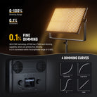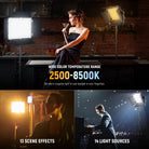- 3 Lighting Modes- The AP150B offers 3 lighting modes: CCT, FX, and SOURCE. In CCT mode, you can adjust the color temperature from 2500K to 8500K (in 100K increments). FX mode has 13 scene effects, while SOURCE mode supports 14 source matching. With PWM technology, AP150B filming light allows precise dimming from 0 to 100% in 0.1% increments. It also provides 4 dimming curves (exponential, logarithmic, S, linear) for varied lighting needs