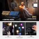 - APP/2.4G/Panel/DMX Control- 4 control methods to meet both the pro and novice. Easily achieve wireless control and multi light group management via the NEEWER APP; realize master and slave light control (AP150C, PL60C, FS300C, FS150C, RGB2, RGB1200, MS60C, MC60B, MS150B, FS150B, BH30S, CB60B, etc.) with the built in 2.4G module; and make parameter adjustments easily with the panel with a TFT color display. A 5 pin DMX port can connect to a DMX console for complex multi light setups