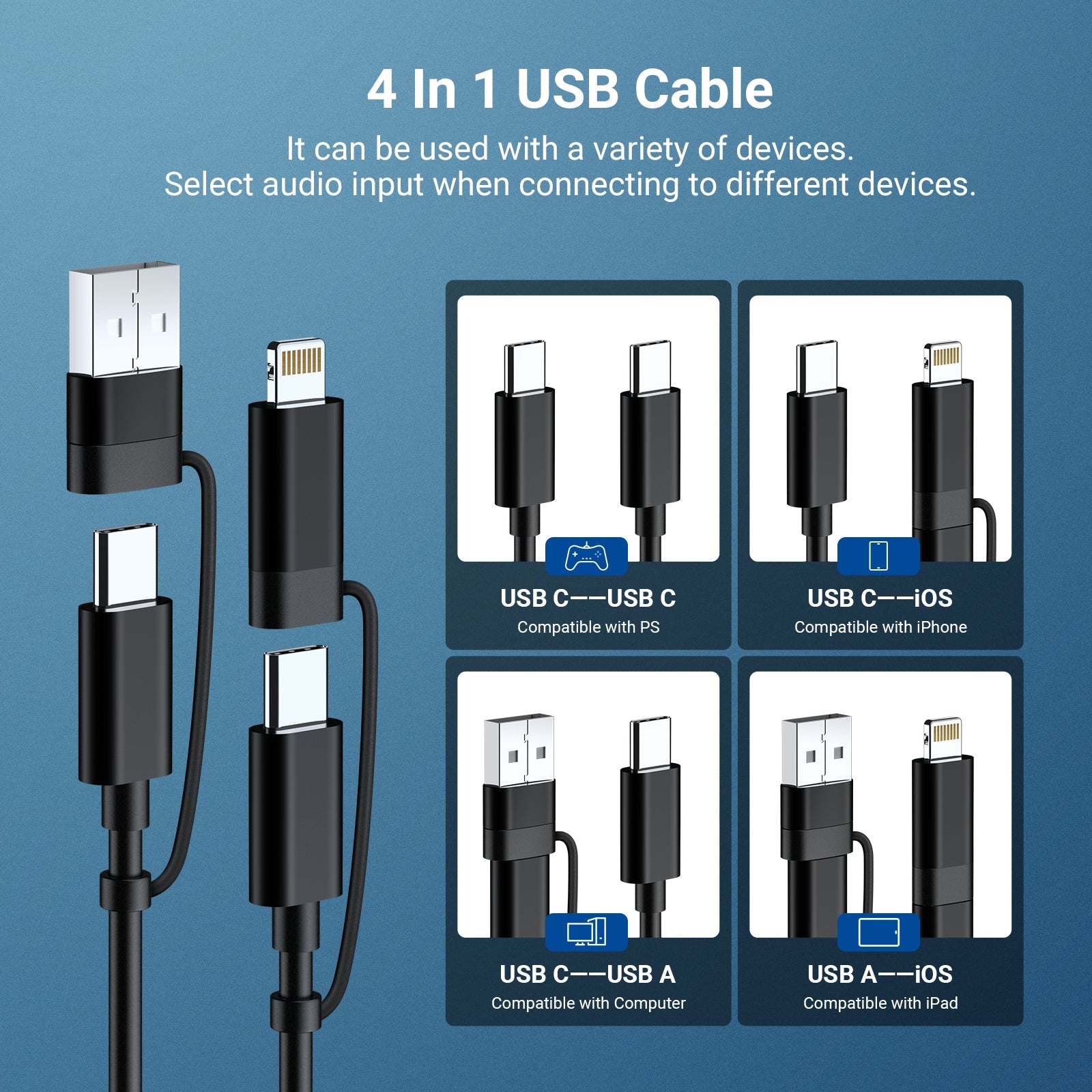 - Plug & Play Microphone- Connect to a computer/laptop via an included 4 in 1 USB cable (USB C, USB A, and iOS connectors) and start speaking—no drivers needed. Compatible with macOS Windows PC iPhone Android for video conference, online teaching, Zoom calls, gaming chat, roundtable podcast, and more. Note: Set UM04 external mic as the default input device when several audio devices connected to PC. Some phones may require OTG function activation