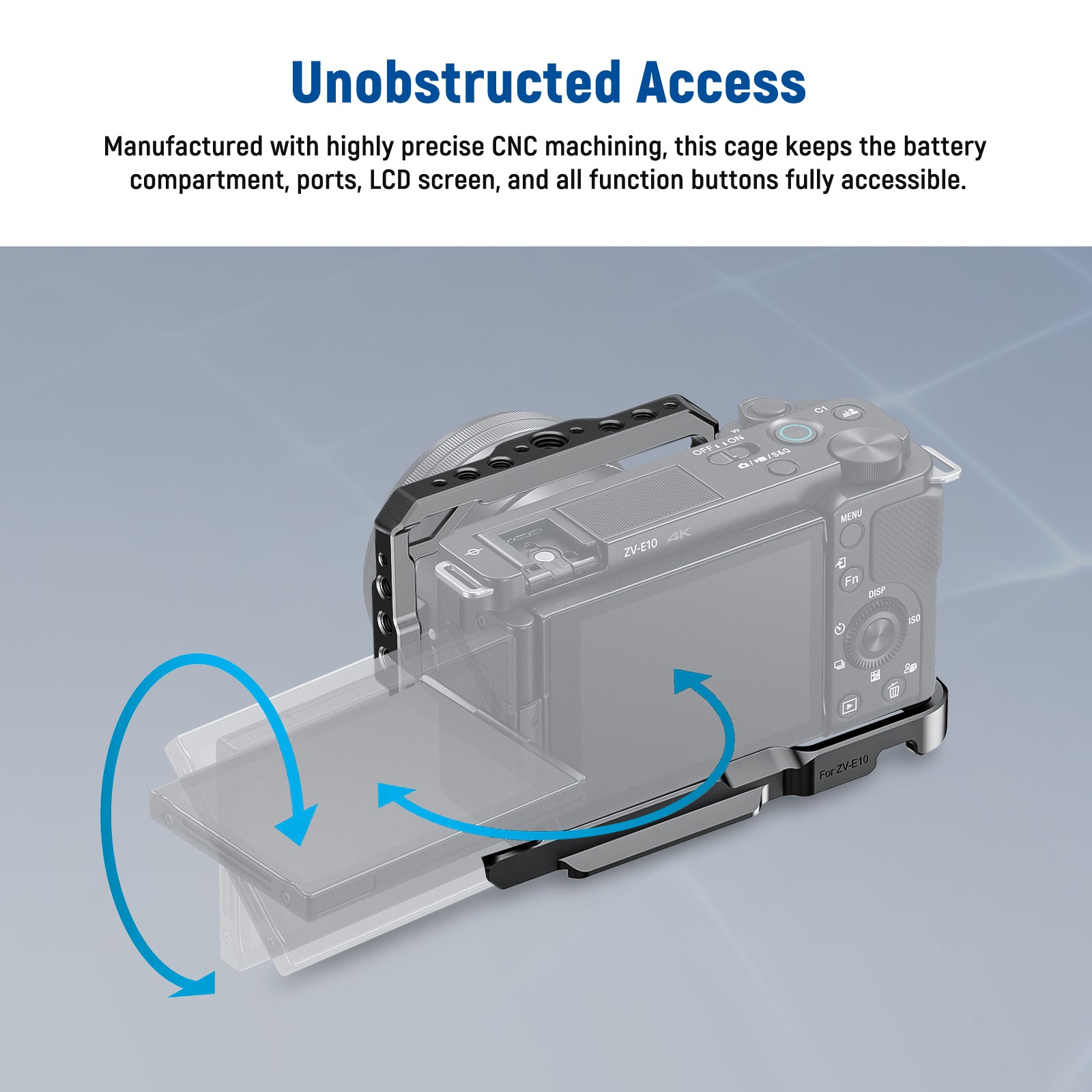 • Compatible with Sony ZV-E10- NEEWER CA003S is a CNC machined aluminum formfitting cage for the ZV-E10 vlog camera. Full access via precision cutouts for buttons, ports, card slots, LCD flip screen, and an expanded hot shoe area to be compatible with Sony ECM-W2BT Microphone HVL-F32M Flash, and other accessories. It also features a slot for the dummy battery cable, allowing flat placement on tables. Weighing just 4.6oz/129g, this cage is lightweight yet robust and protective