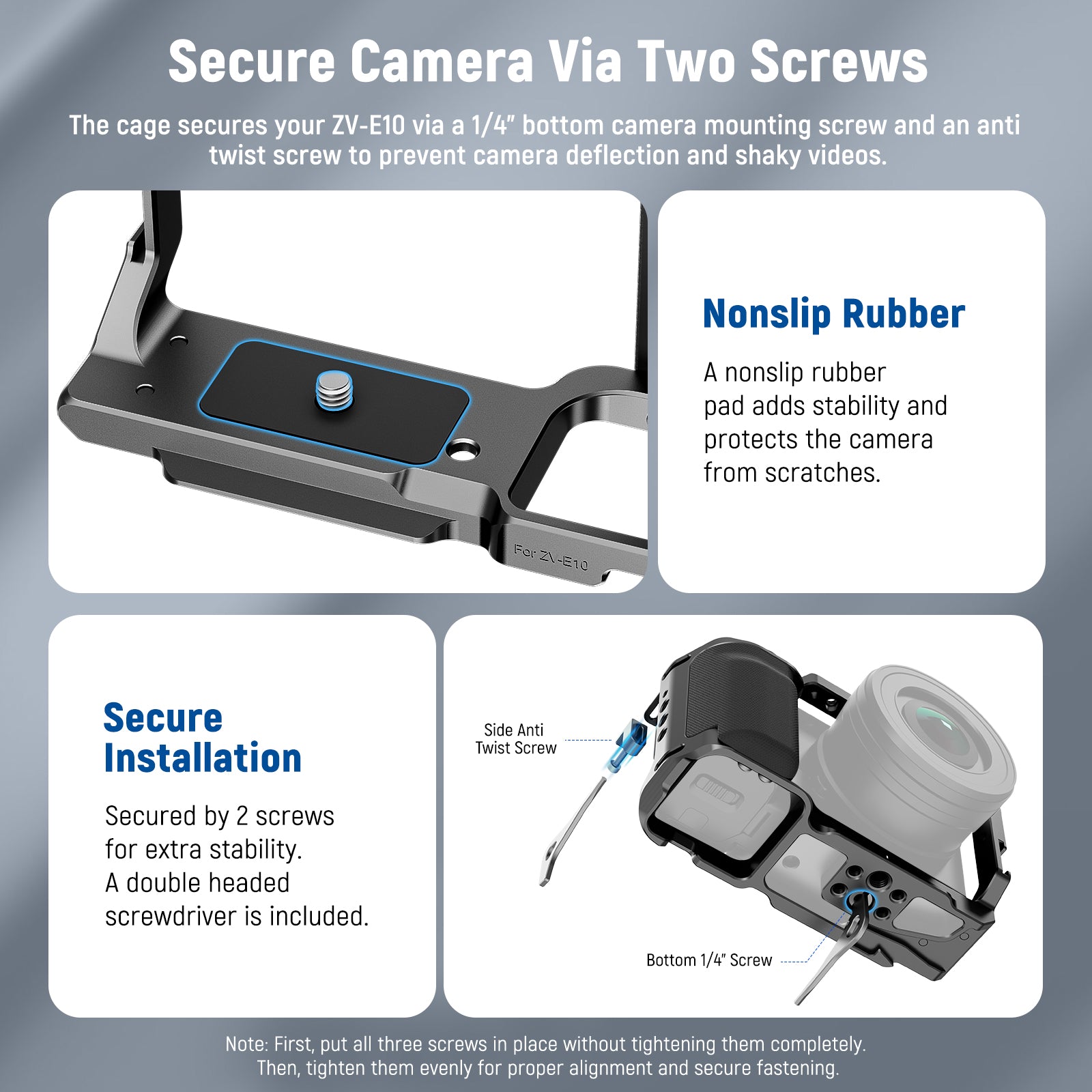 • Secure Camera Via Two Screws- The cage secures your ZV-E10 via a 1/4" bottom camera mounting screw and an anti twist screw to prevent camera deflection and shaky videos. A nonslip rubber pad adds stability and protects the camera from scratches