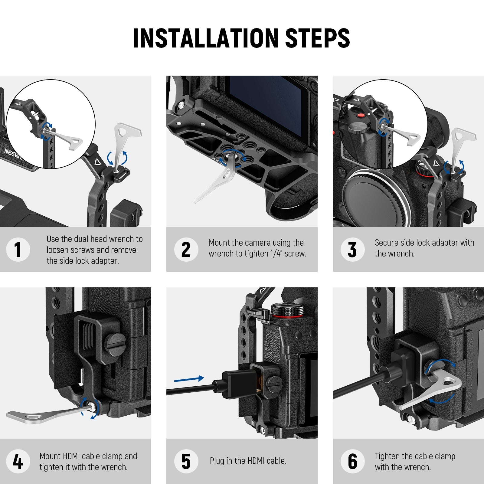 - Triple Anti Twist Locks- Featuring a triple locking system, your camera will be securely fastened using the bottom 1/4" locating screw and two side lock adapters. An included dual head wrench is magnetically stored under the cage to tighten the screws without extra tools effortlessly
