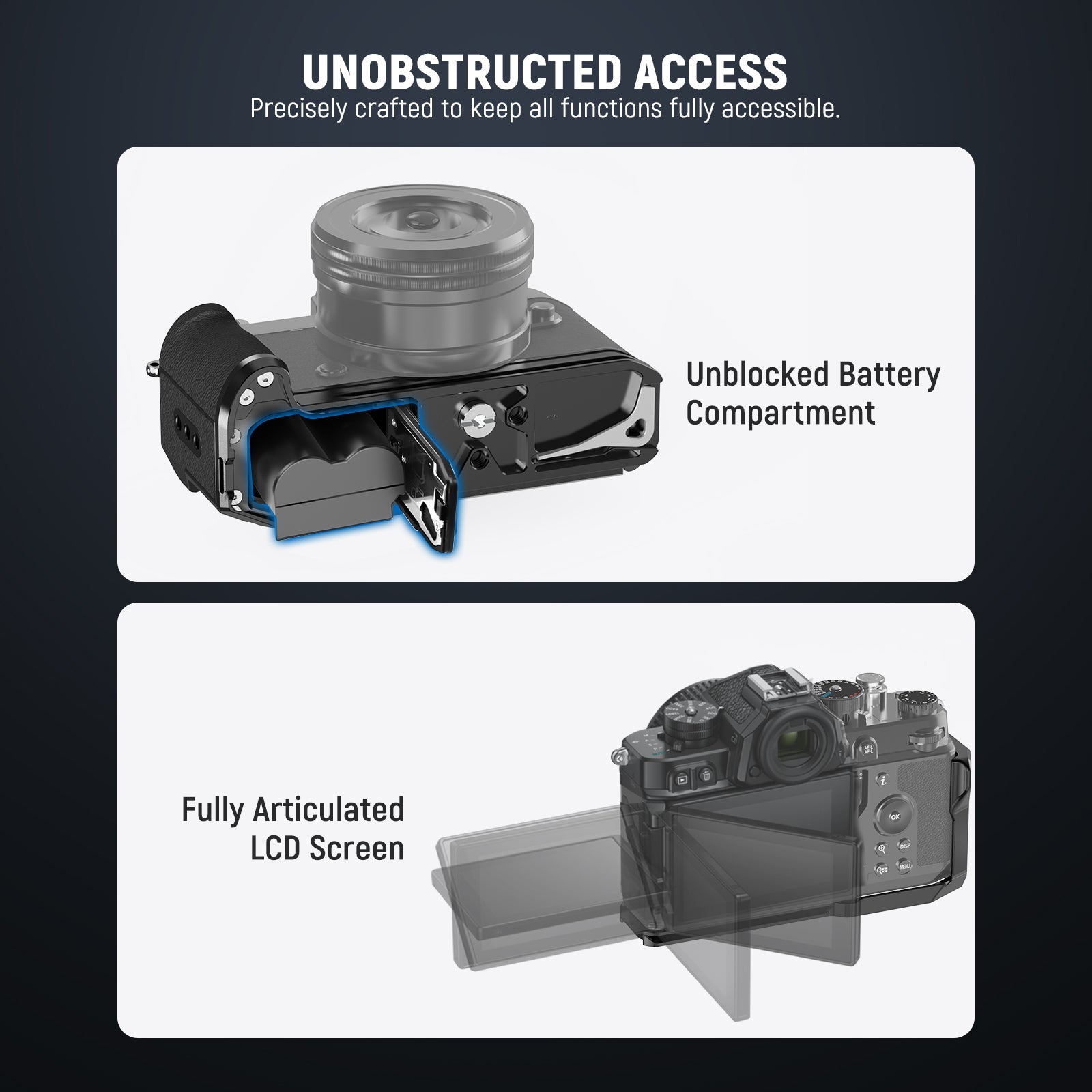 - Compatible with Nikon Zf Camera- Compatible with Nikon Z f digital mirrorless cameras, this retro formfitting baseplate is an homage to the classic film camera era. It attaches to the camera via a 1/4" screw and keeps the battery compartment fully accessible. Accessories include an elegant silver aluminum shutter button cap to enhance the tactile feel and the 2 in 1 wrench to simplify equipment setup for photography and videography