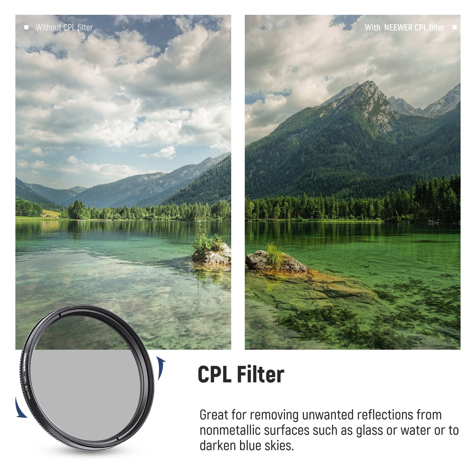 • Versatile Filter Kit- This kit includes 3 filters: A UV filter blocks ultraviolet rays and prevents lens flare. A CPL filter eliminates reflections on nonmetallic surfaces, increases contrast and saturation, and emphasizes details. An ND4 filter reduces lights entering your camera by 2 stops and allows you to capture movements with smooth motion blurs while using a slow shutter speed and wide apertures