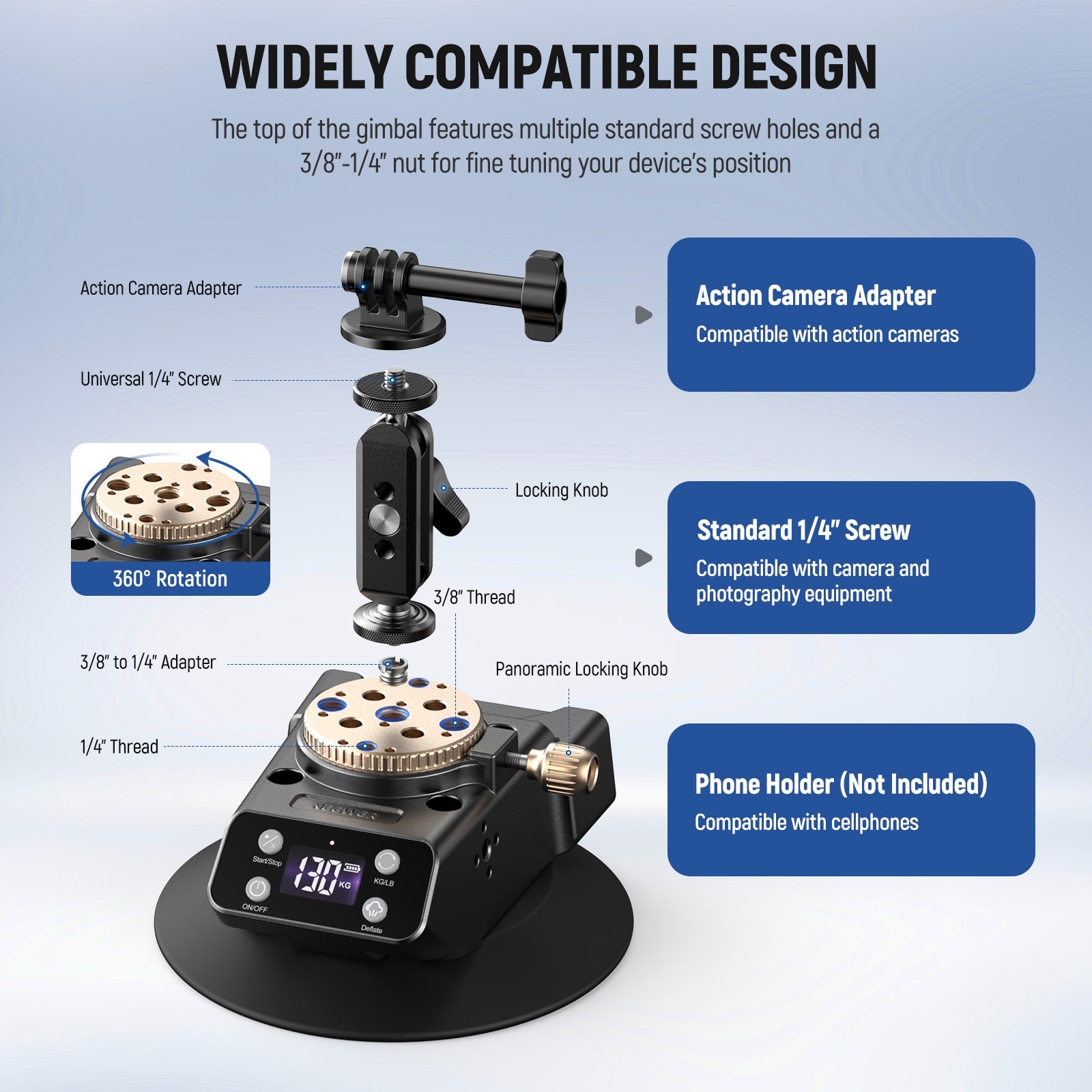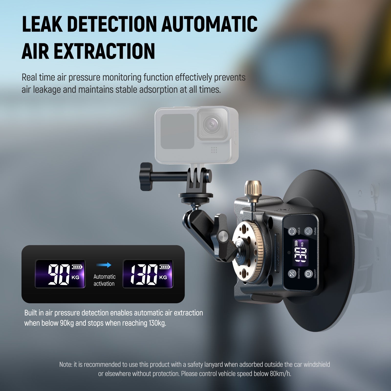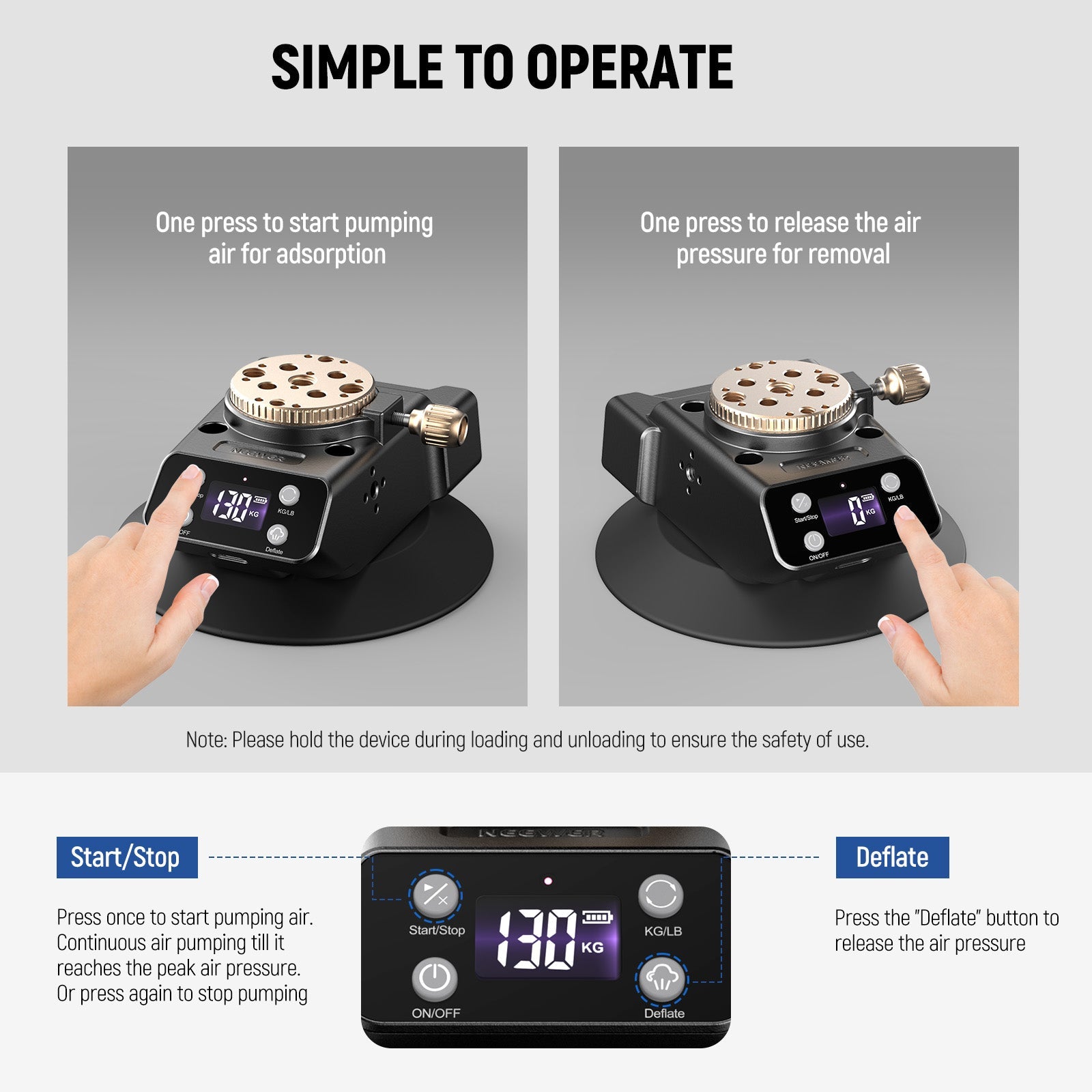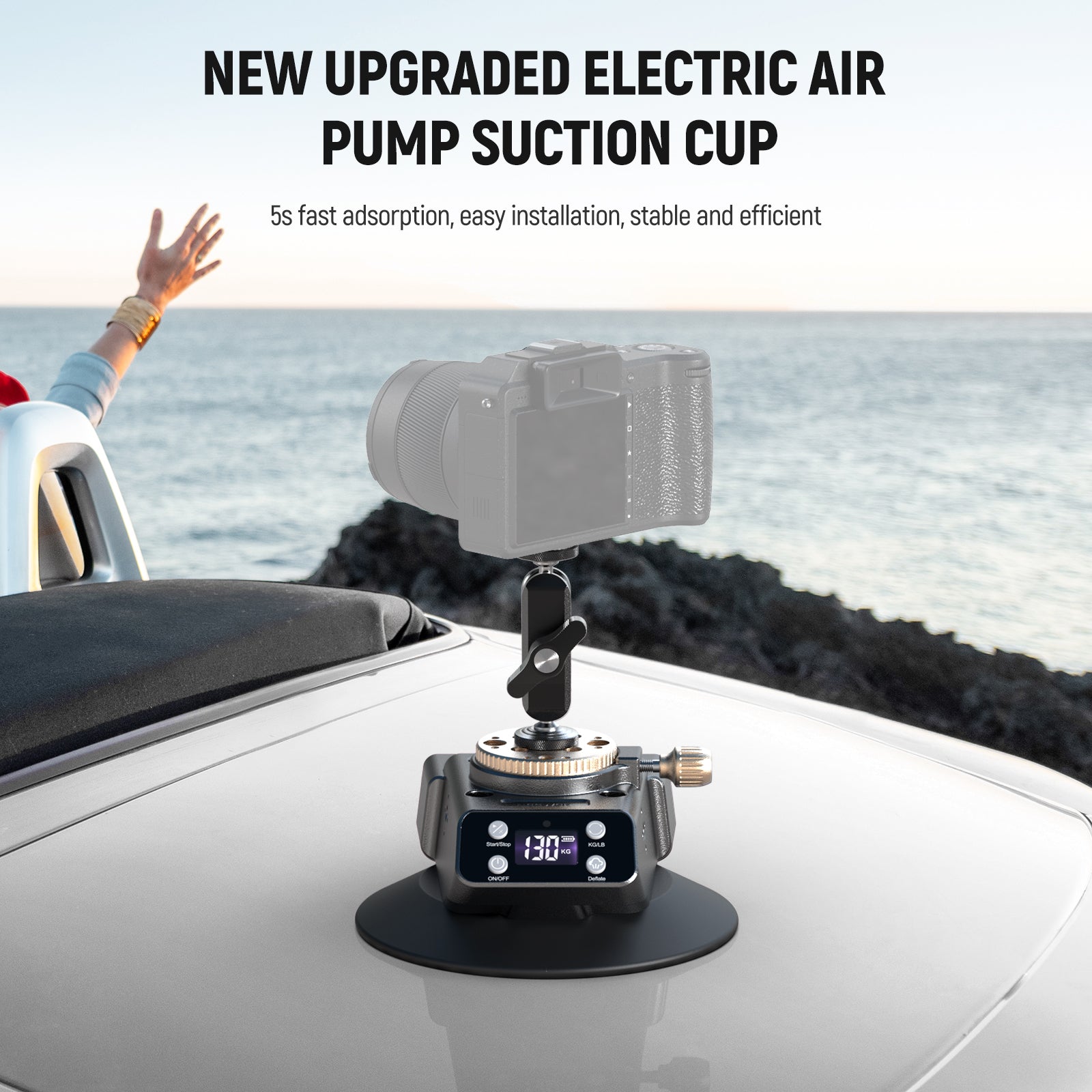 - One Click to Start/Deflate- NEEWER CA017 innovates with electric mounting instead of manual mounting. One click to start the vacuum pumping, fast and accurate. Equipped with a digital display and supports intelligent monitoring of the internal air pressure of the suction cup. One click the “Deflate” button to release the inside air. The indicator light flashes for low battery. note: Please remove the device before deflating to avoid damage by dropping, and keep an eye on the battery level