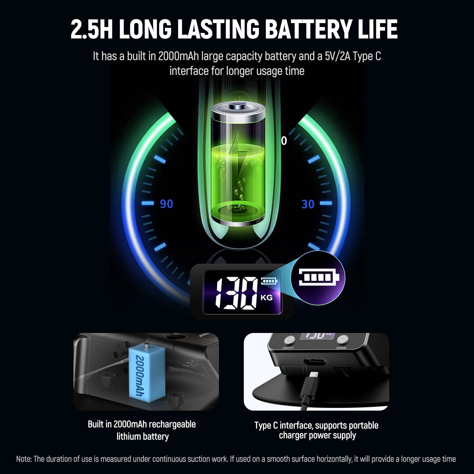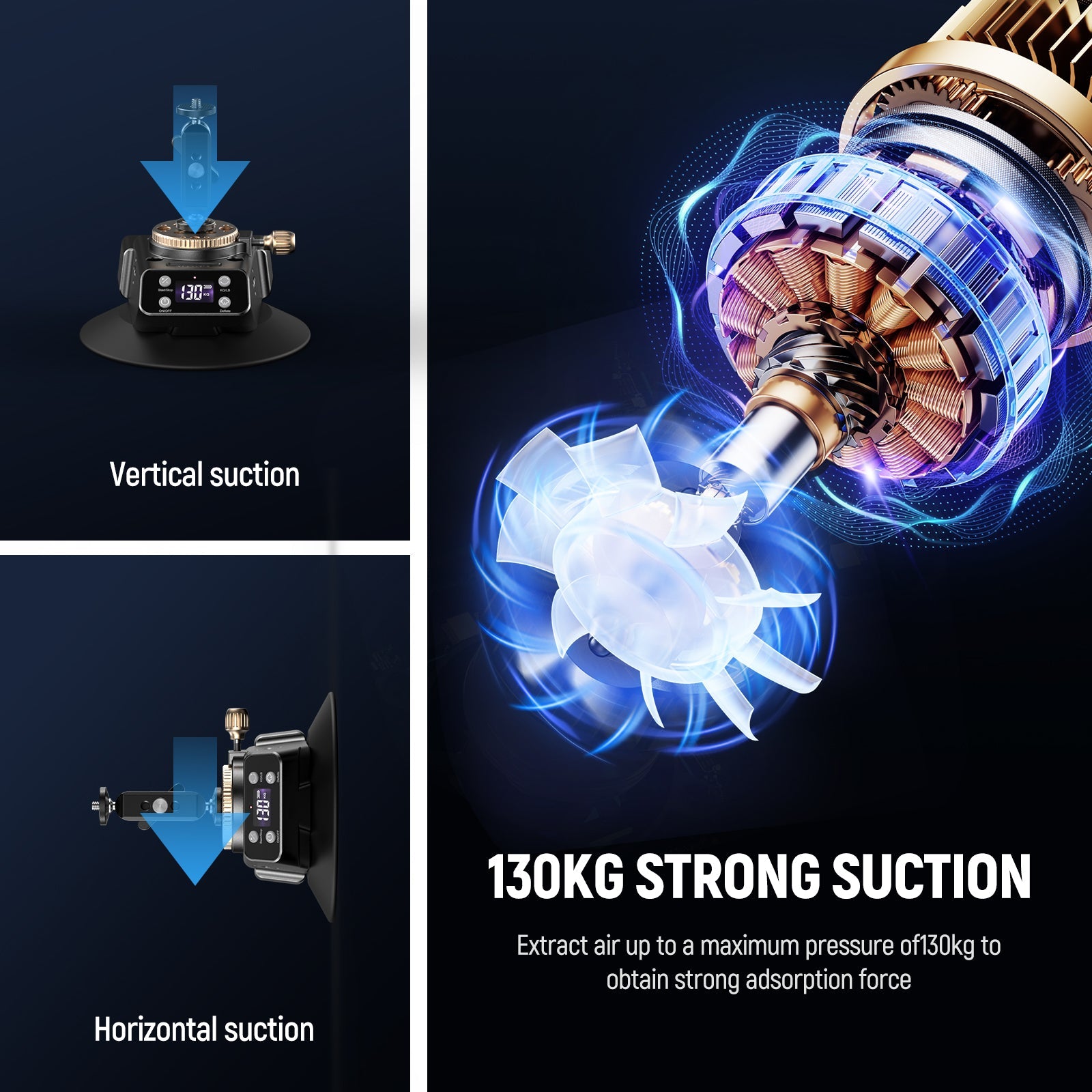 - Automatic Air Pump- If the vacuum pressure falls below 90kg, the pump will automatically start until the vacuum pressure is restored. It will stop extracting air when it reaches 130kg. The suction cup stays stable and firm all the time. Note: Please pay attention to the suction force of the display