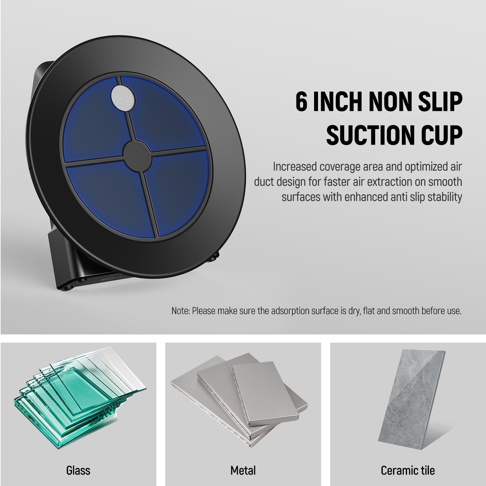Premium Construction- Crafted with rigid aluminum alloy, the electric suction cup mount can withstand uncertain outdoor environments. The silicone rubber cup is robust and easy to clean with water. Note: If residues appear on car and desktop surfaces, please clean them with alcohol.
