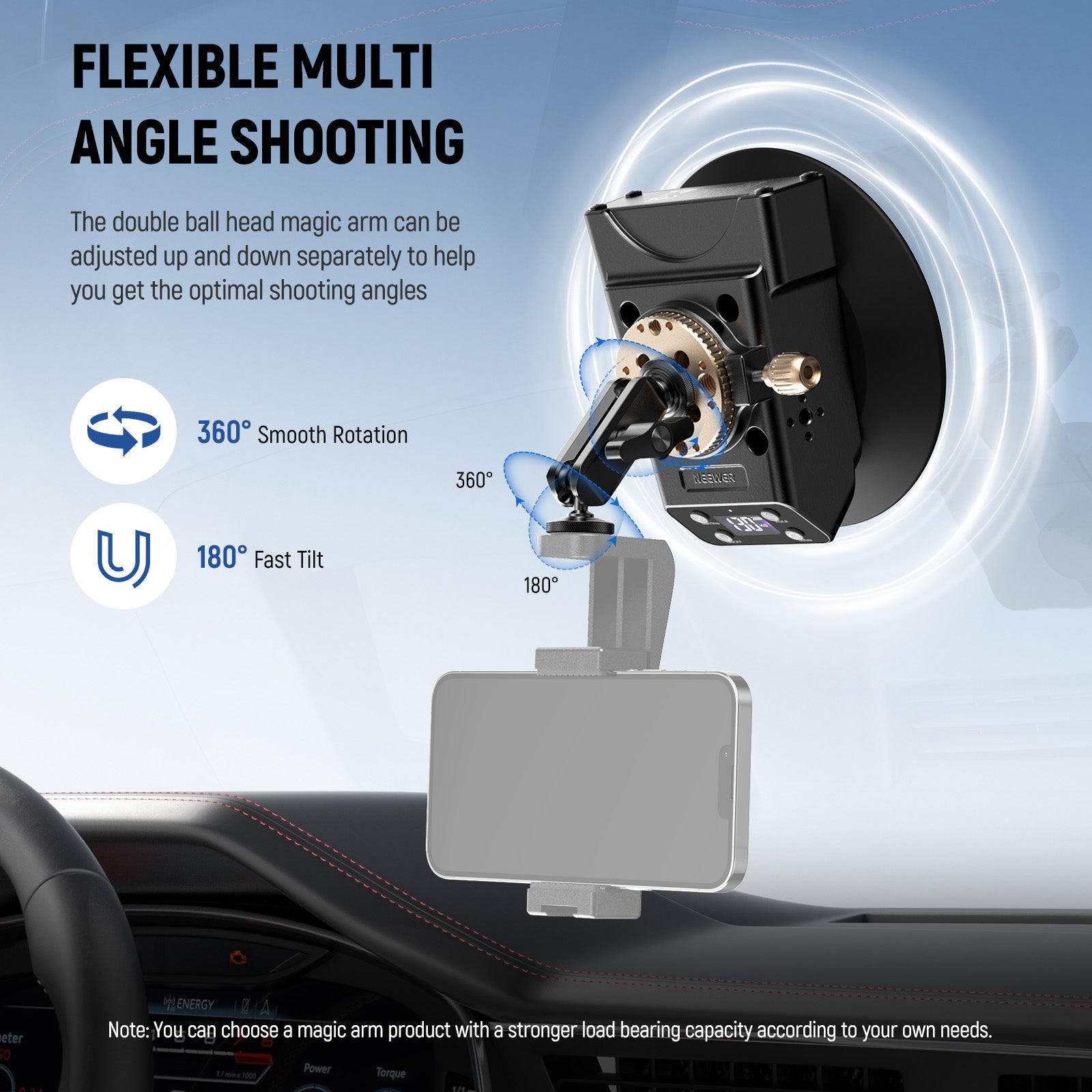 - Powerful Suction, Strong Load Capacity- CA017 is a powerful pump activated vacuum suction cup that can firmly stick to smooth, flat, non porous surfaces like glass, tile, and automotive surfaces. At movement speeds up to 60km/h (37mph), the maximum bearing weight is up to 11lb/5kg. Note: The clamping force of the Ball Head Magic Arm will vary in different application circumstances
