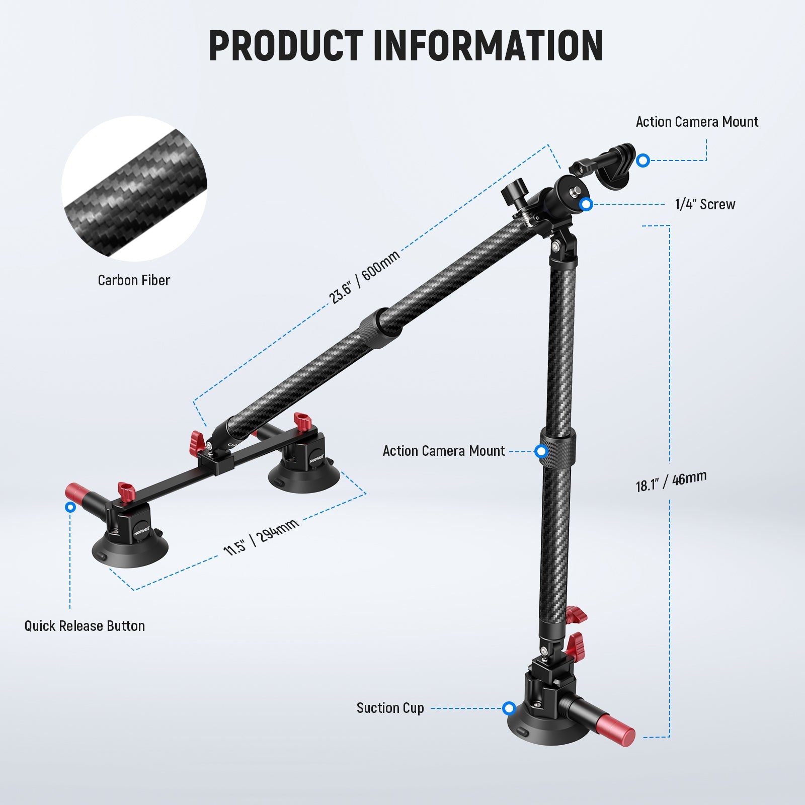 - Double Telescopic Extension Poles- The carbon fiber extension poles can extend up to 24"/60cm. The robust carbon fiber construction ensures a high 2.2lb/1kg load capacity. Flexible tilt movements enable versatile camera angles, while a 0.95"/24mm oval clamp ensures secure connections