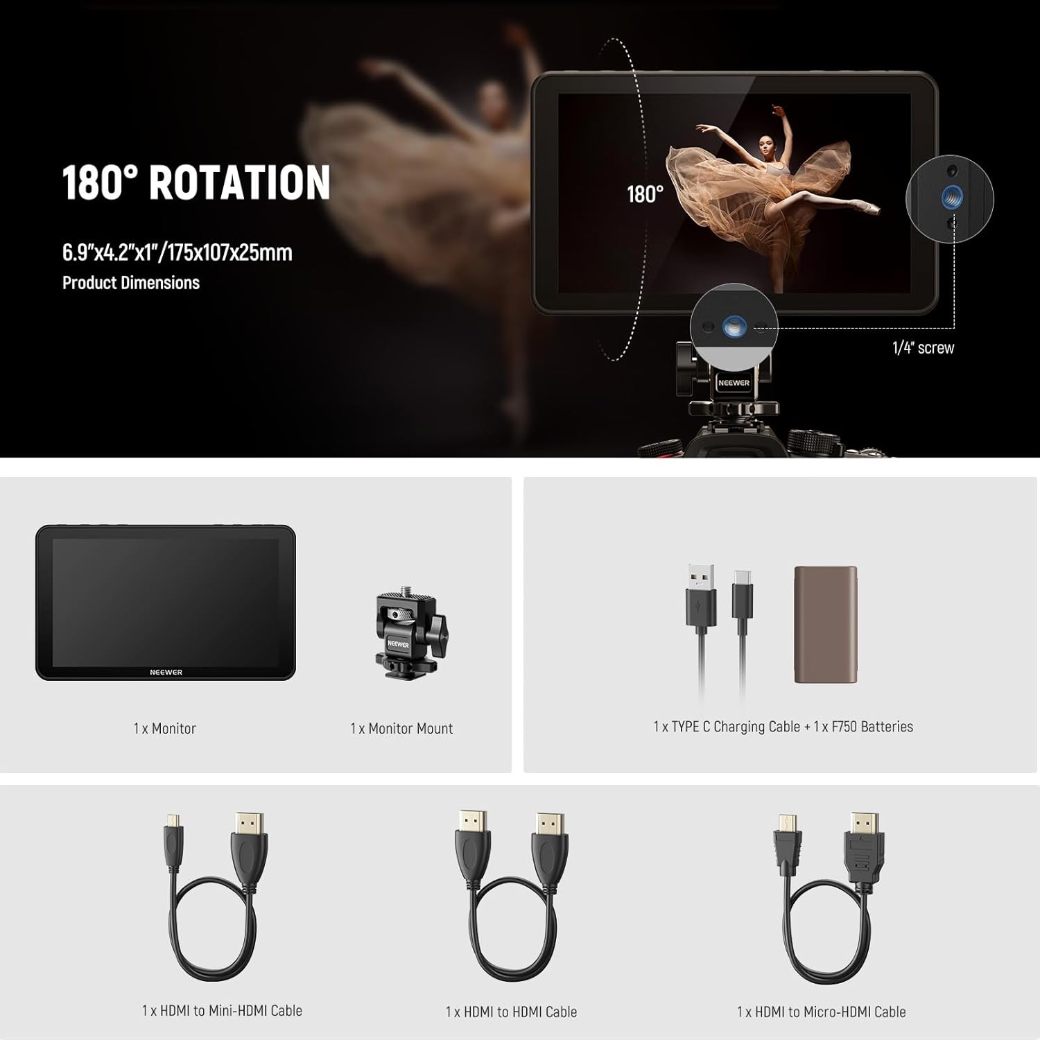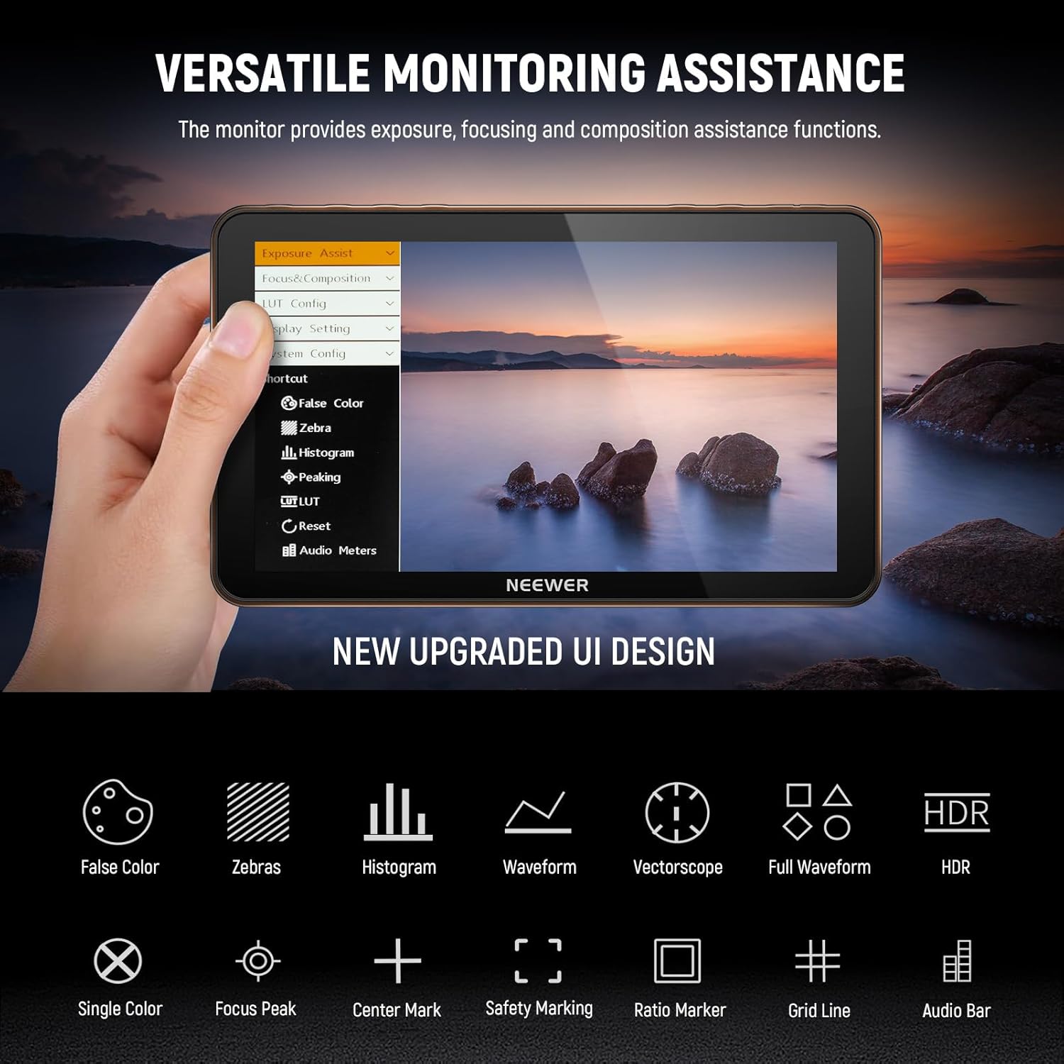 - Versatile Monitoring & Custom 3D LUT Upload- Adopting the professional Rec.709 HD color standard, the field monitor offers False Color, Zebras, Histogram, Oscillogram, Full Waveform, Vectorscope, HDR, Single Color, Peak Focus, Audio Bar, and more professional functions, with shortcut buttons (F1, F2, F3) on top for quick access. With 15 preloaded 3D LUTs, the monitor supports up to 60 custom 3D LUT file uploading, and even firmware upgrading via an SD card (not included)