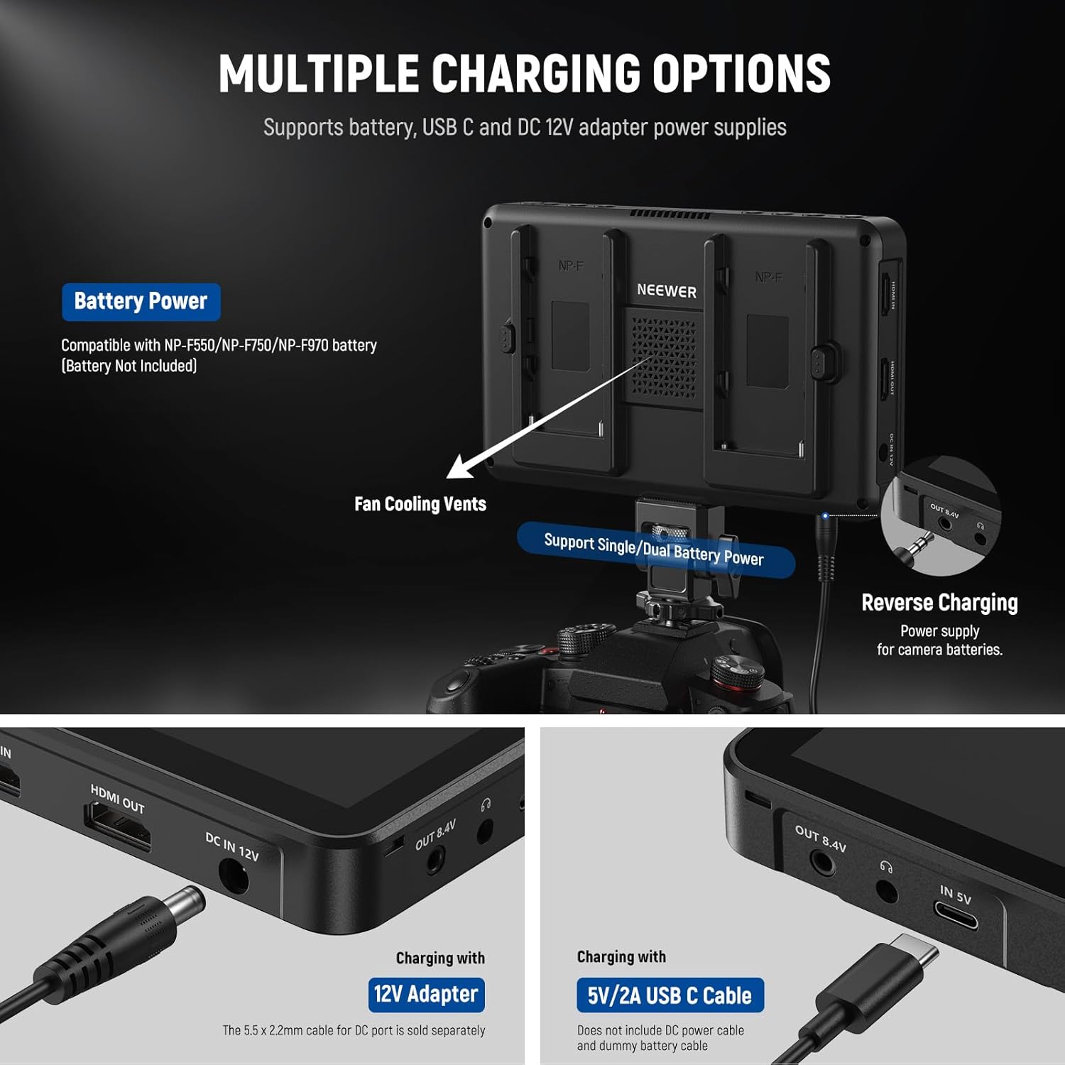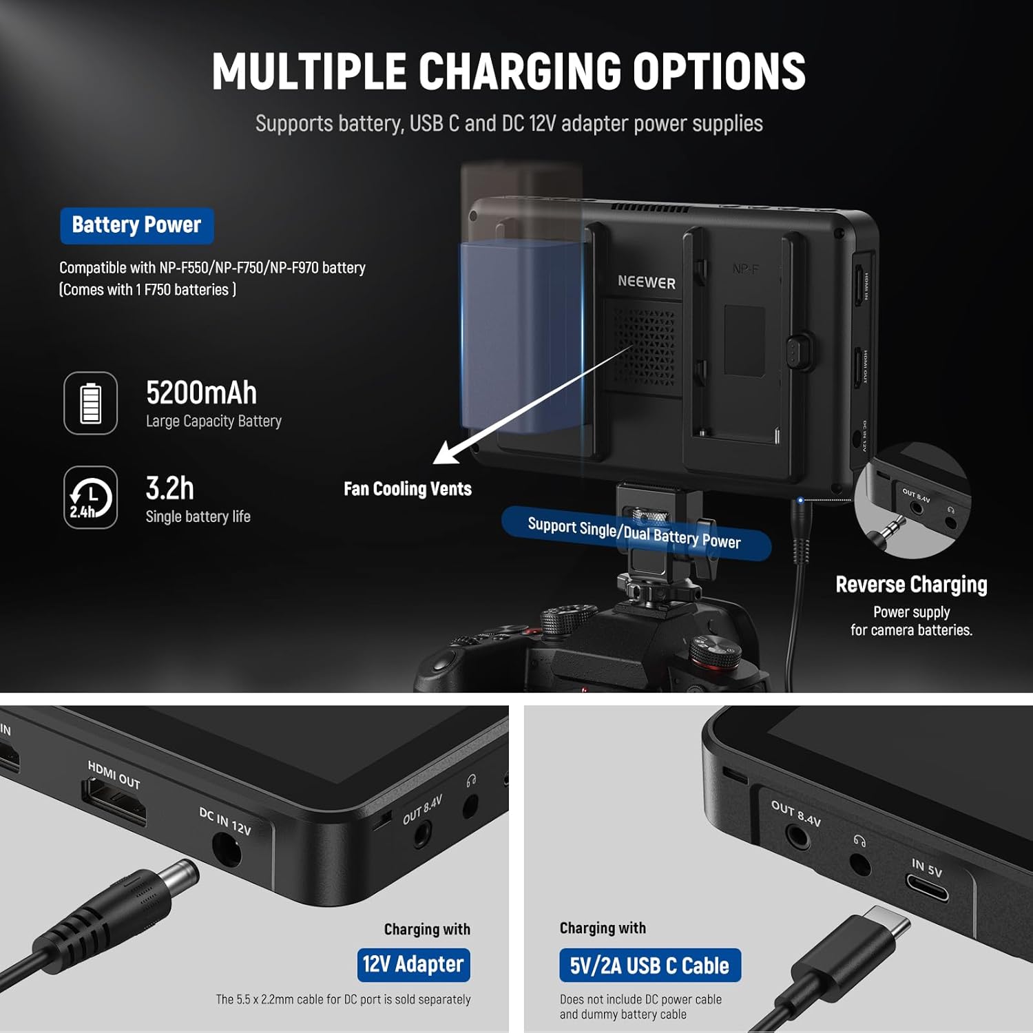 - Versatile Power Supply Options- The DSLR monitor supports NP-F battery compatibility (NP-F550/750/970), DC port (cable not included), and Type C charging. The two 4400mAh NP-F750 batteries included provide 2.4 hours of runtime each or 4.8 hours combined, and can be charged using 5V/3A or higher fast chargers or portable chargers (3A output) and the included USB to Type C cable. The monitor also works as a dummy battery for camera via a DC 8V/1.5A output for prolonged outdoor filming