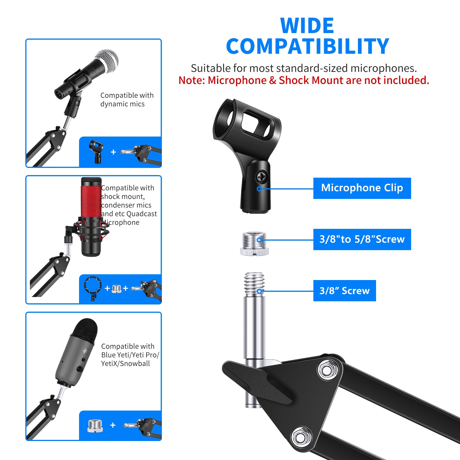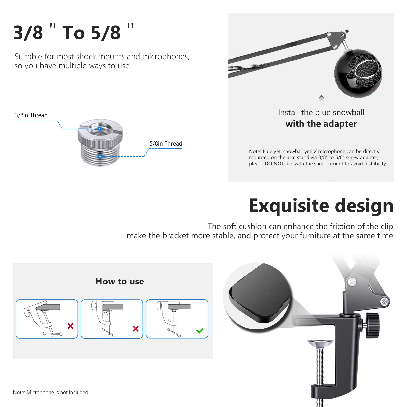 - 3/8” to 5/8” Screw Adapter & Mic Clip- The 3/8” to 5/8” adapter allows you to mount a compatible microphone (like Blue Yeti or Blue Snowball) on the boom arm. It’s not compatible with Blue Yeti Nano which has a 1/4” thread mount. The microphone clip mounts a microphone with a shaft diameter of 1.26”/3.2cm to the boom arm